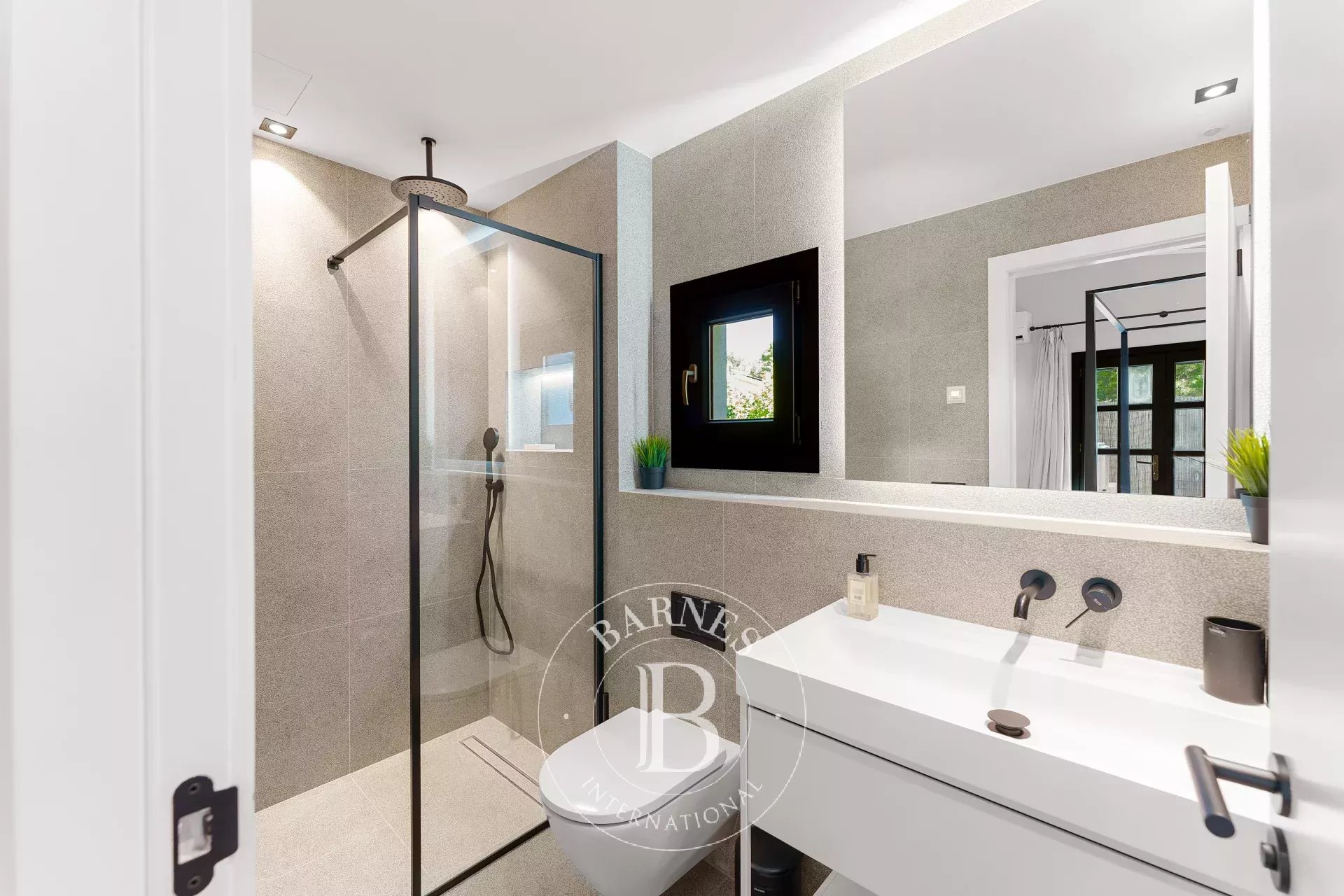Outside, the villa is framed by manicured gardens and private areas for relaxing, including a sun-drenched pool area and an outdoor kitchen with barbecue. Every detail, from the underfloor heating and integrated sound system to high-speed internet and climate control, has been considered to provide year-round comfort.