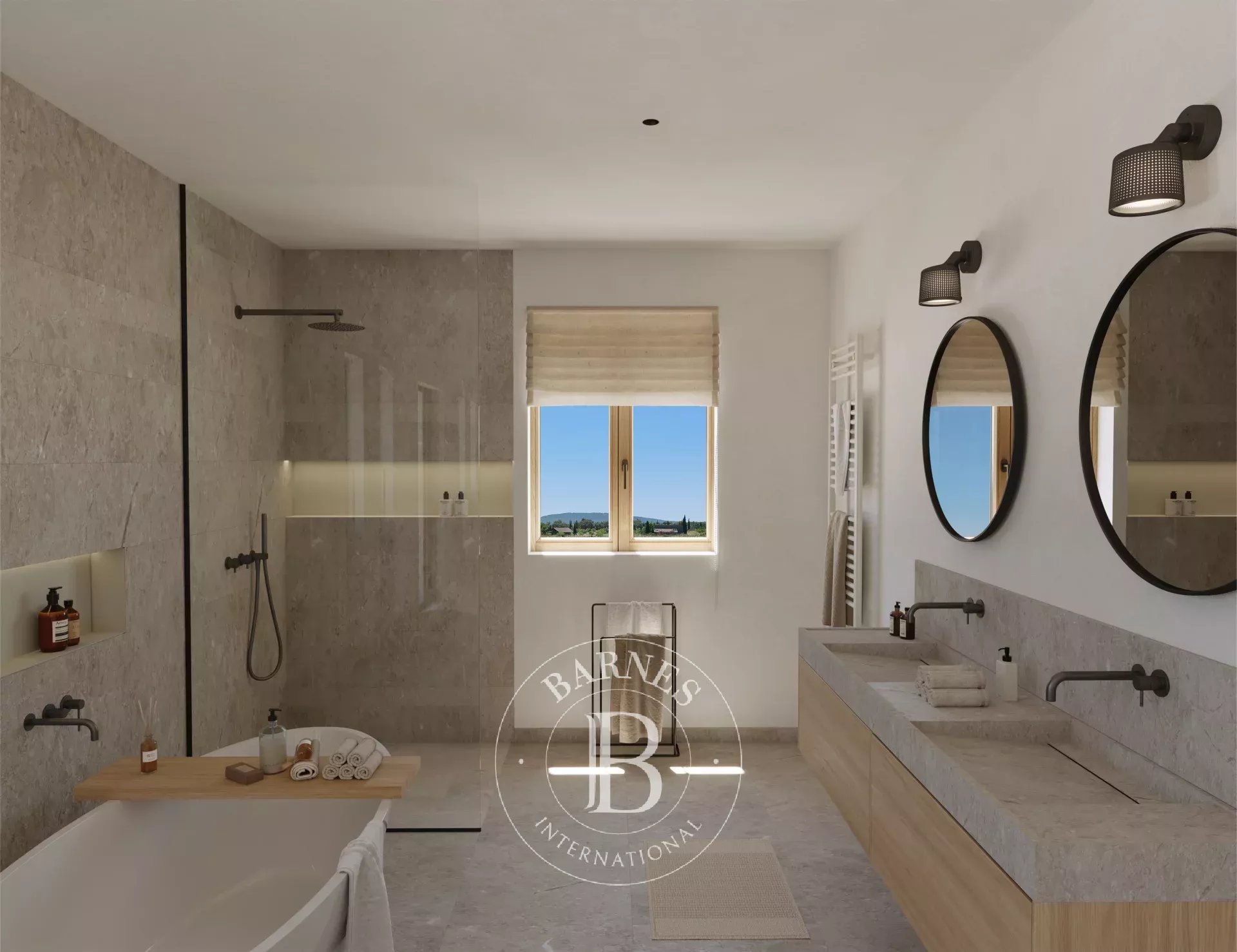 Das Haus umfasst etwa 332 m2 Wohnfläche auf zwei Ebenen. Das Erdgeschoss verfügt über einen Wohnbereich mit doppelter Raumhöhe, Natursteinwand und Tunnelkamin, der in einen offenen Ess und Küchenbereich übergeht. Die Küche ist mit Miele Geraeten, einer großen Insel, maßgefertigten Schränken und einem temperaturkontrollierten Weinregal ausgestattet. Eine Galerie im Obergeschoss bietet Platz für Bibliothek, Buero oder Lounge. Insgesamt gibt es vier Schlafzimmer darunter drei Hauptschlafzimmer und eine Gaestesuite sowie vier voll ausgestattete Badezimmer und ein Gaestebad. Große Fenster mit Stahlrahmen und energieeffiziente Eichenfenster mit Fensterlaeden sorgen für viel Tageslicht und ein angenehmes Raumklima, unterstützt durch Fußbodenheizung und Klimaanlage mit Mitsubishi Waermepumpe. Marmorboden in Gris Zarzi verläuft durch das gesamte Haus.