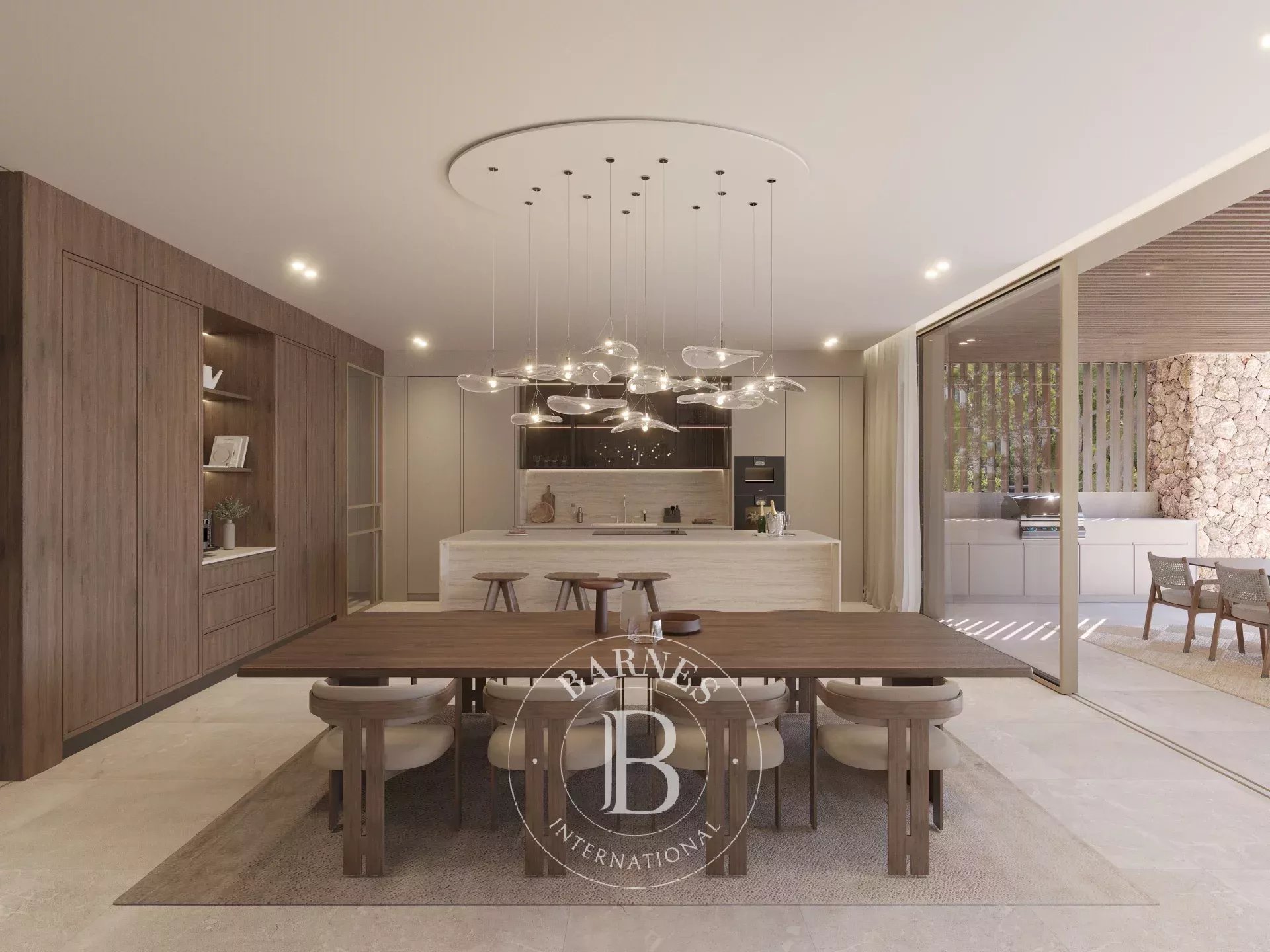 En la planta principal, el salón y el comedor se abren ampliamente hacia la terraza gracias a grandes paneles de cristal. El espacio exterior con zona chill-out y piscina de agua salada se integra de forma natural con el interior, creando un ambiente perfecto tanto para relajarse como para recibir invitados. La orientación y el diseño permiten disfrutar de amplias vistas al mar durante todo el día.