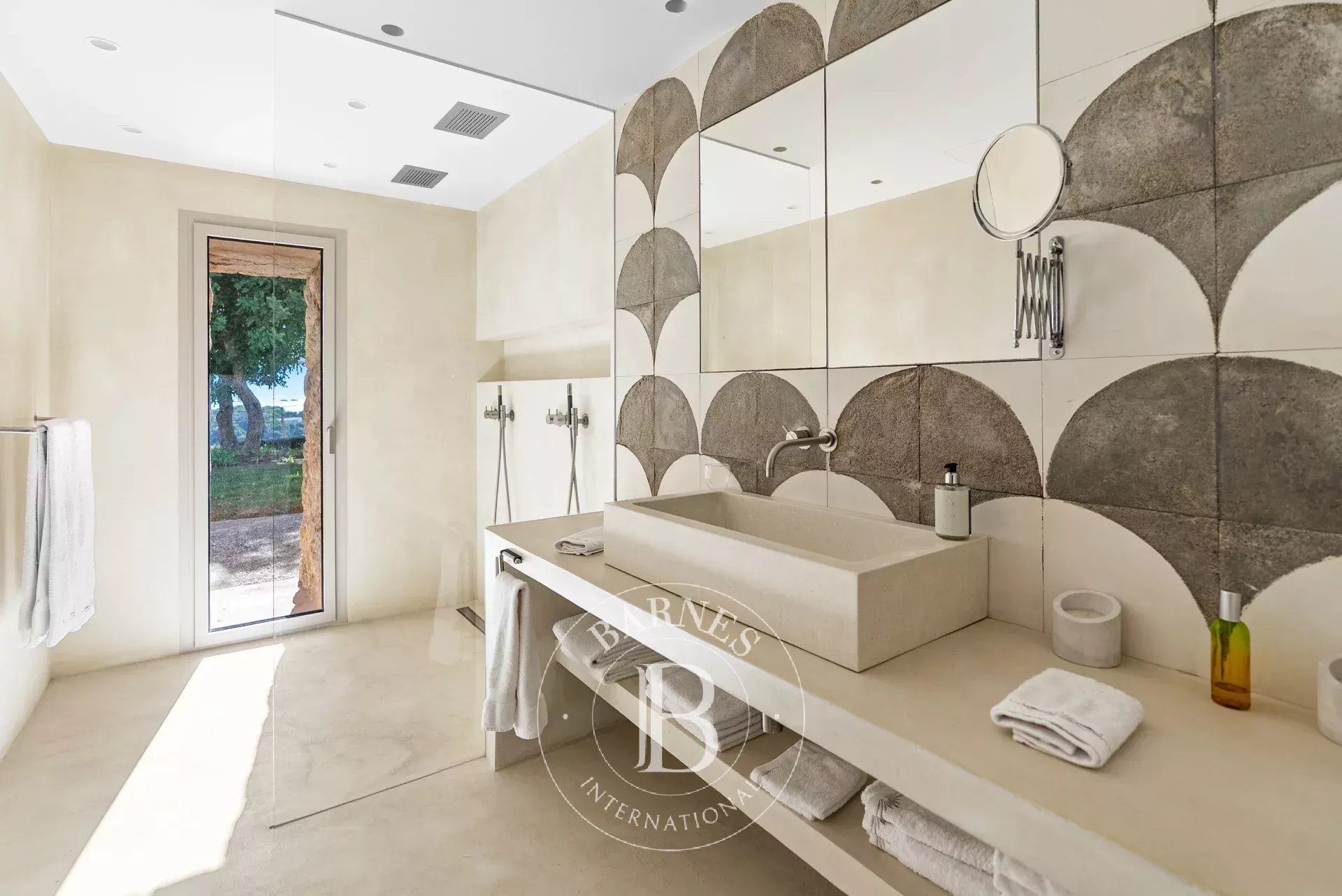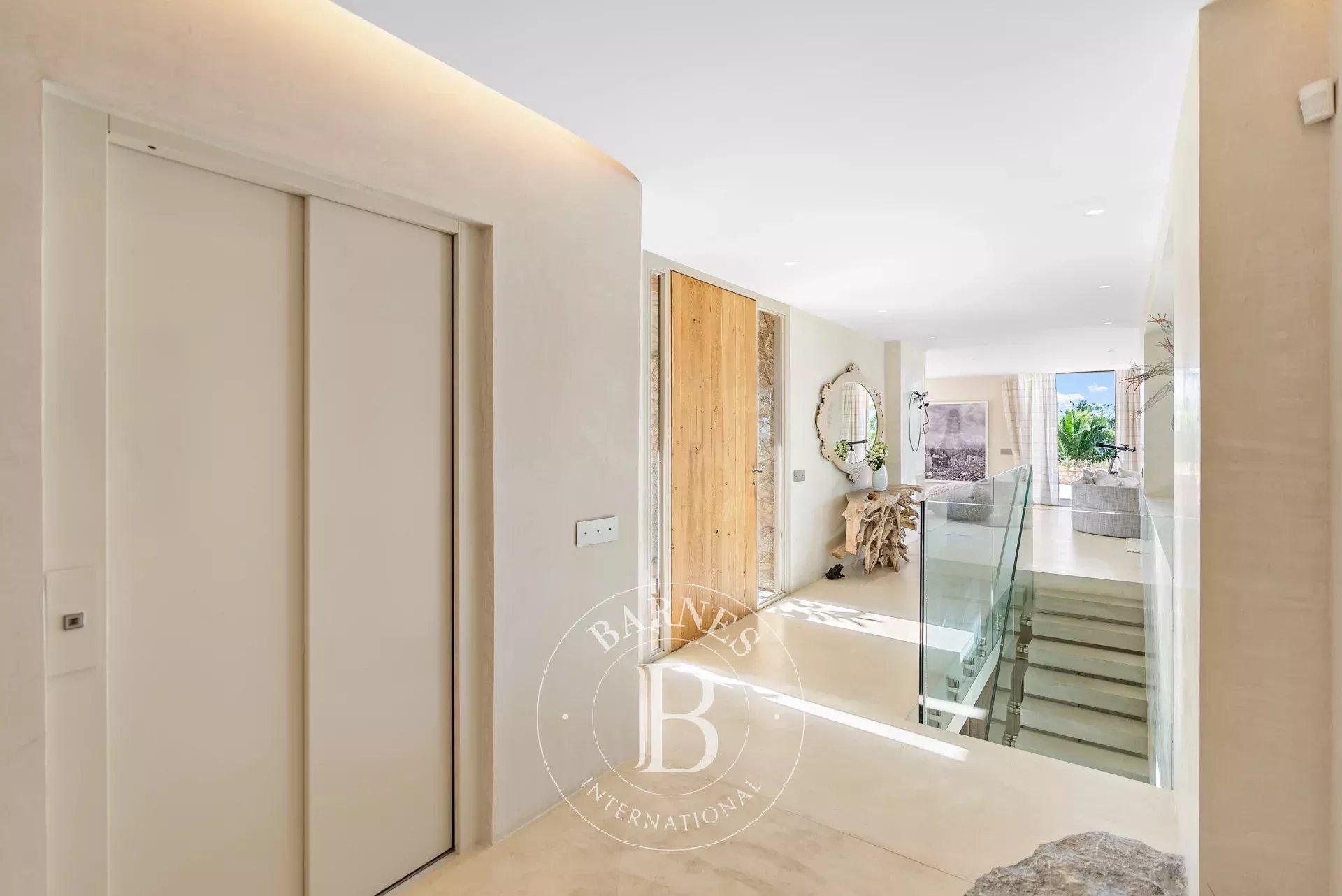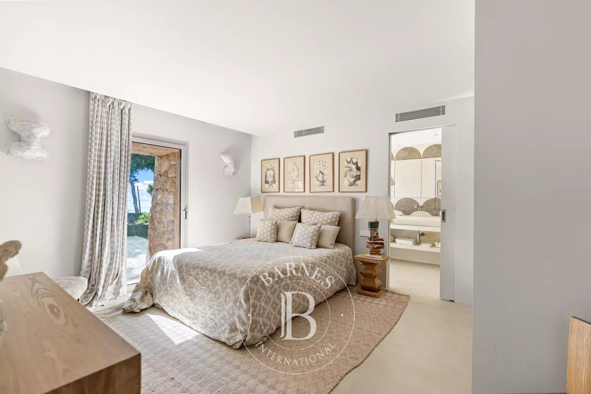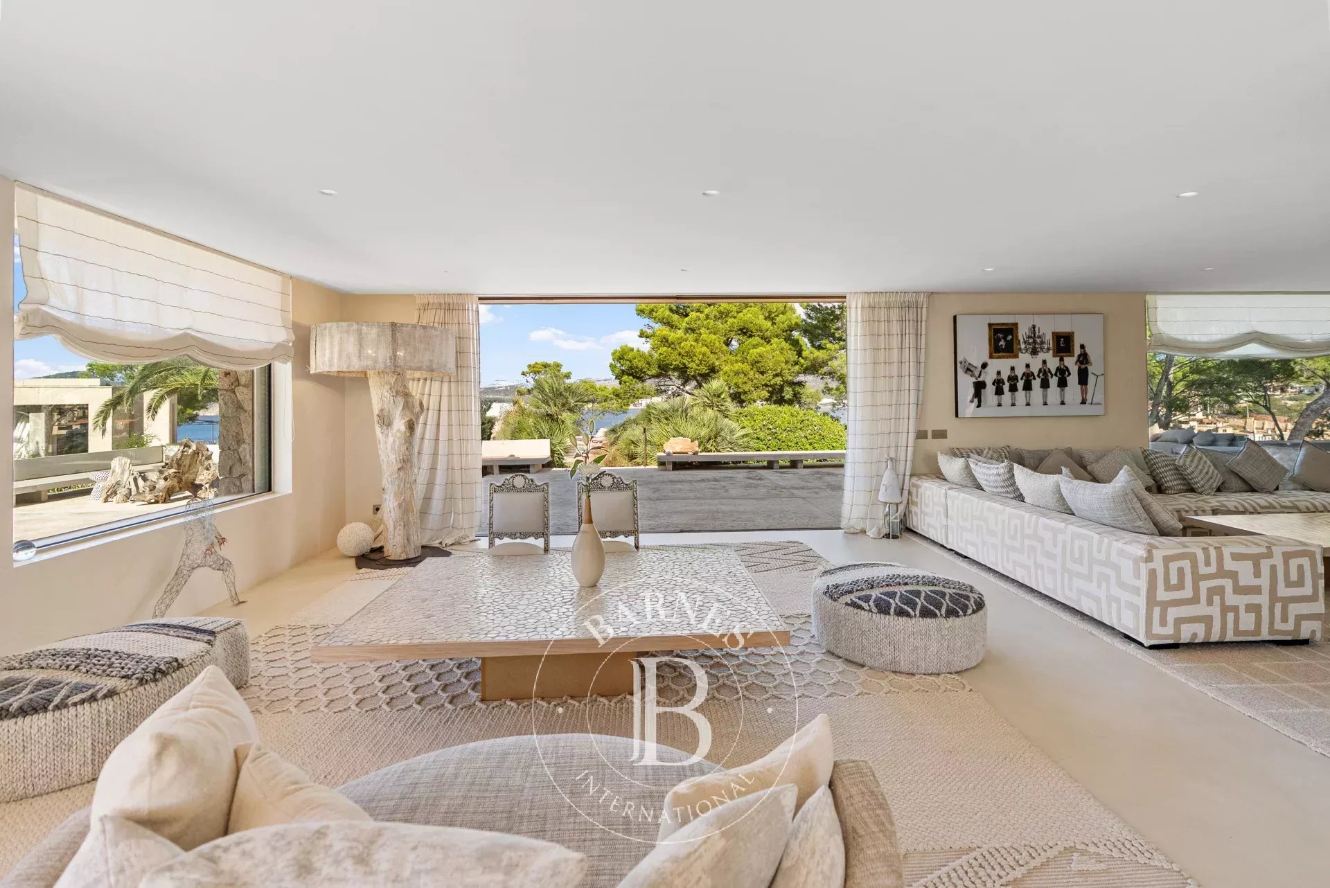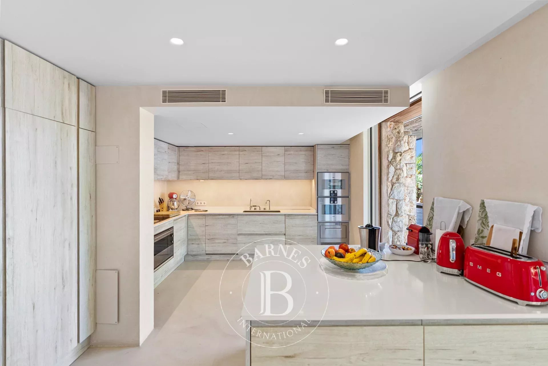 A l'interieur, les espaces de vie de la villa sont lumineux et accueillants, avec de grandes fenetres qui encadrent l'horizon mediterraneen. Le chauffage au sol avec pompe a chaleur, une cuisine totalement equipee avec menuiserie sur mesure et un ascenseur Elevaric offrent un confort moderne sans compromettre l'integrite estetique de la propriete. Le design allie elegance d'inspiration boheme et finitions de haute qualite, creant un environnement harmonieux pour la detente et le divertissement.