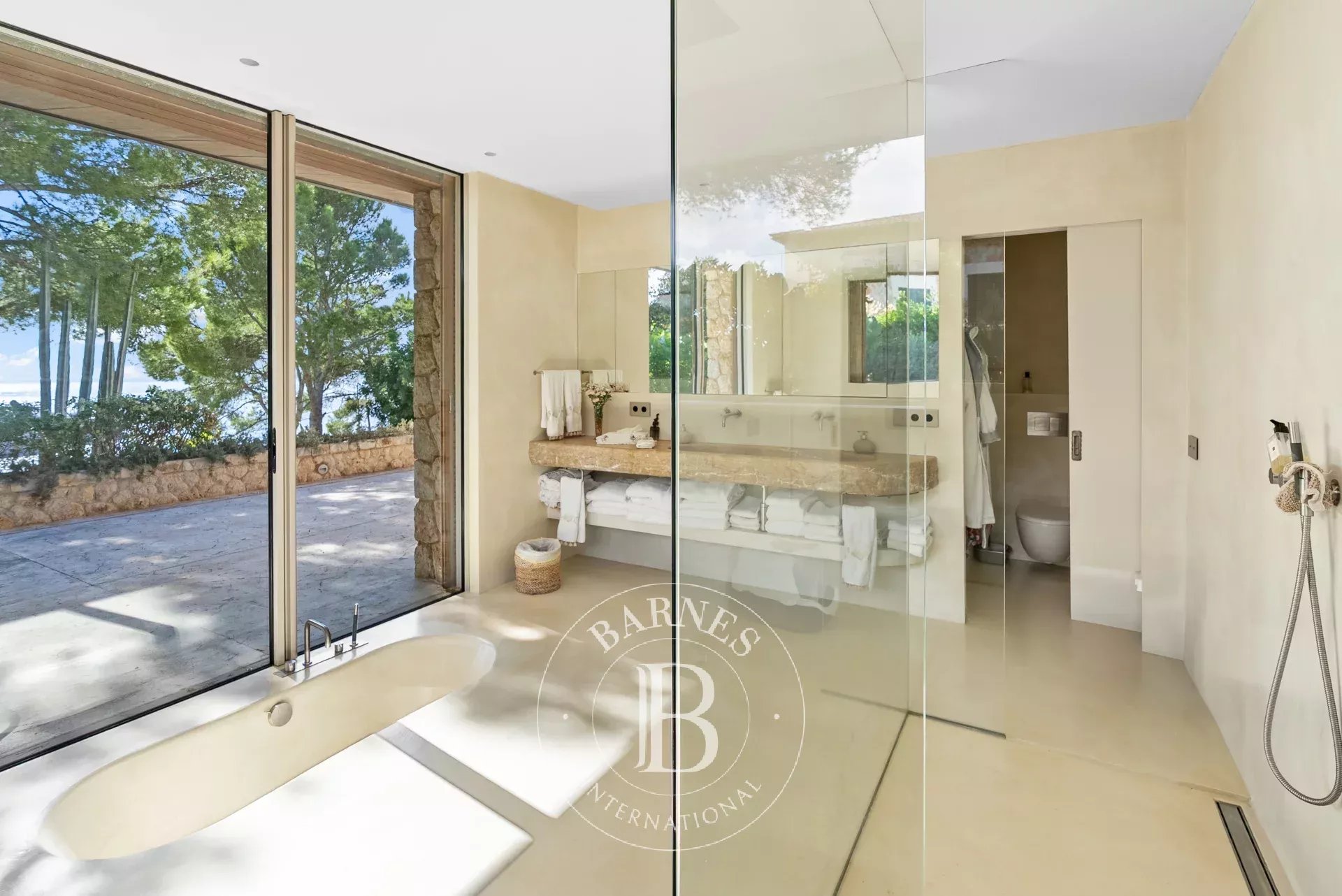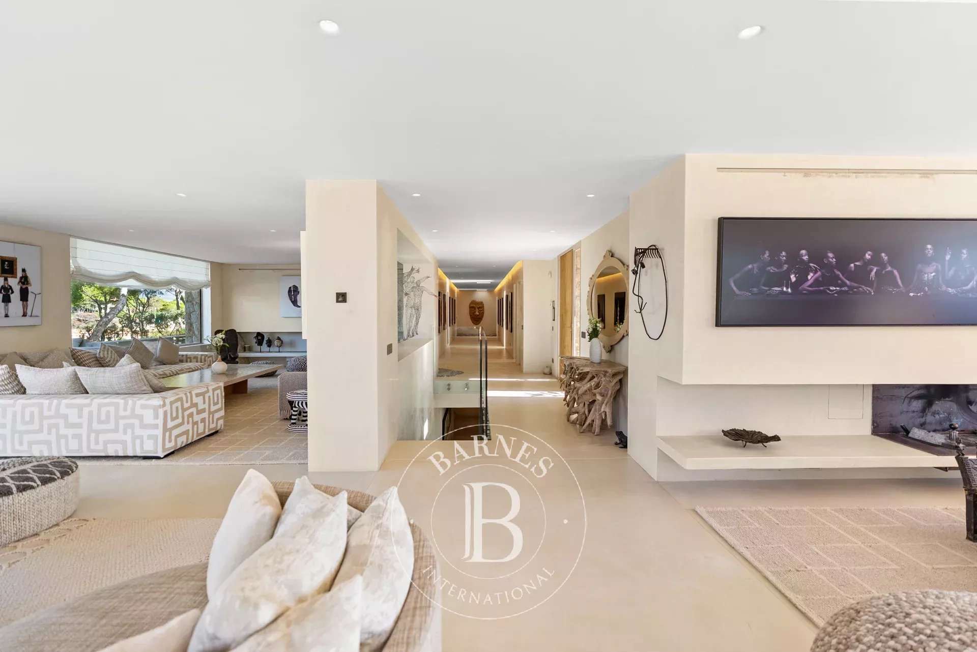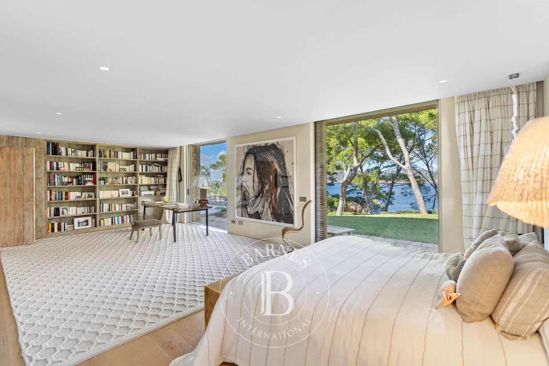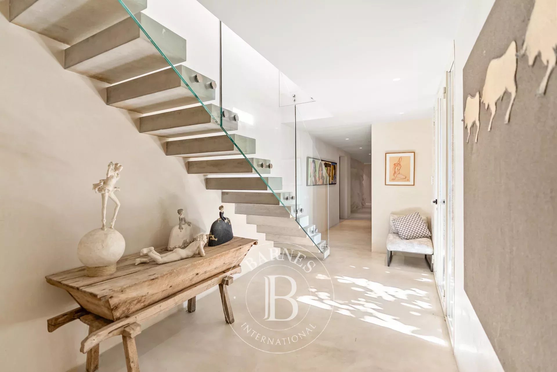 A l'interieur, les espaces de vie de la villa sont lumineux et accueillants, avec de grandes fenetres qui encadrent l'horizon mediterraneen. Le chauffage au sol avec pompe a chaleur, une cuisine totalement equipee avec menuiserie sur mesure et un ascenseur Elevaric offrent un confort moderne sans compromettre l'integrite estetique de la propriete. Le design allie elegance d'inspiration boheme et finitions de haute qualite, creant un environnement harmonieux pour la detente et le divertissement.