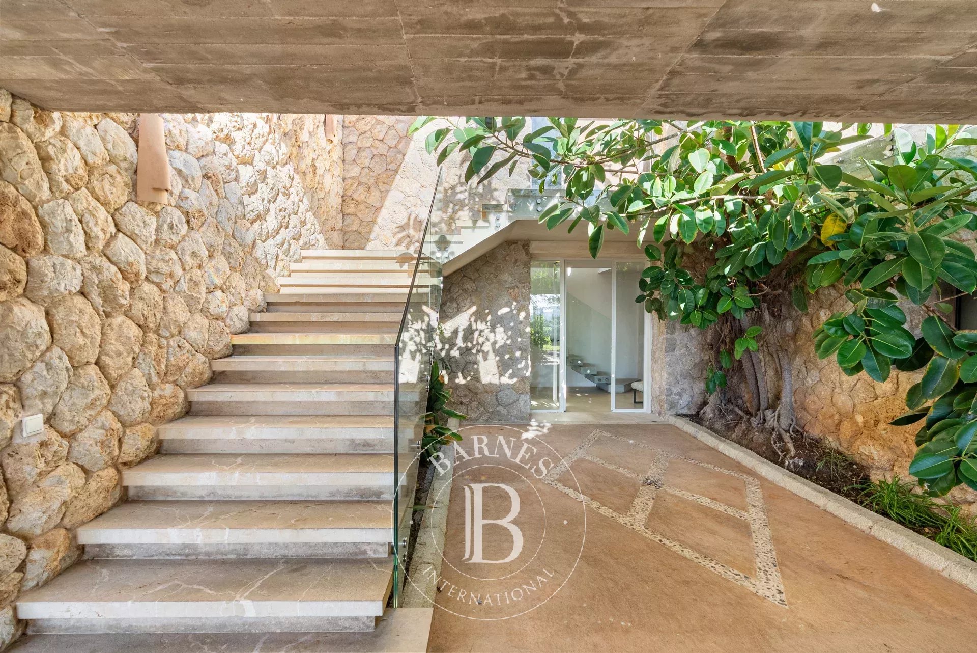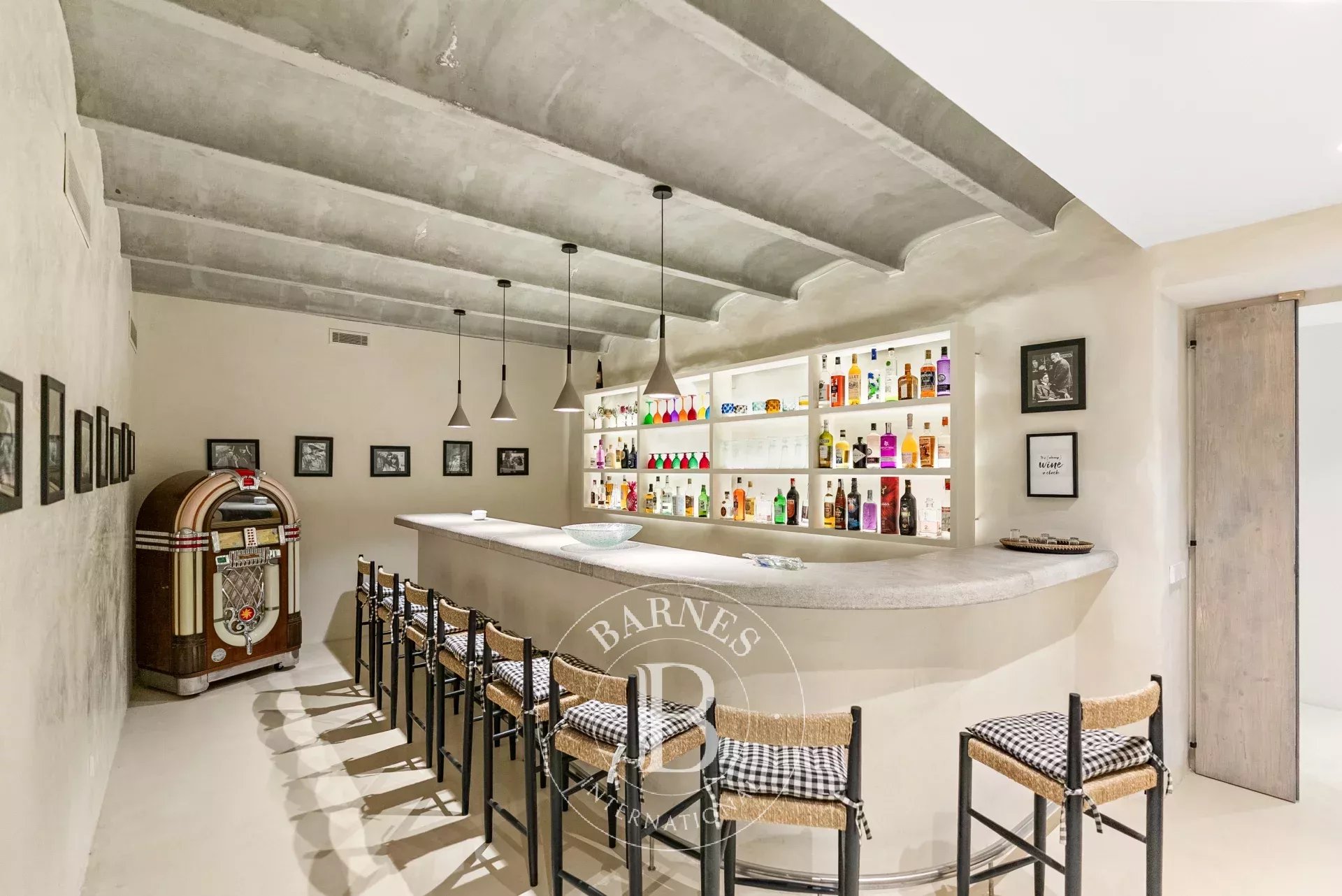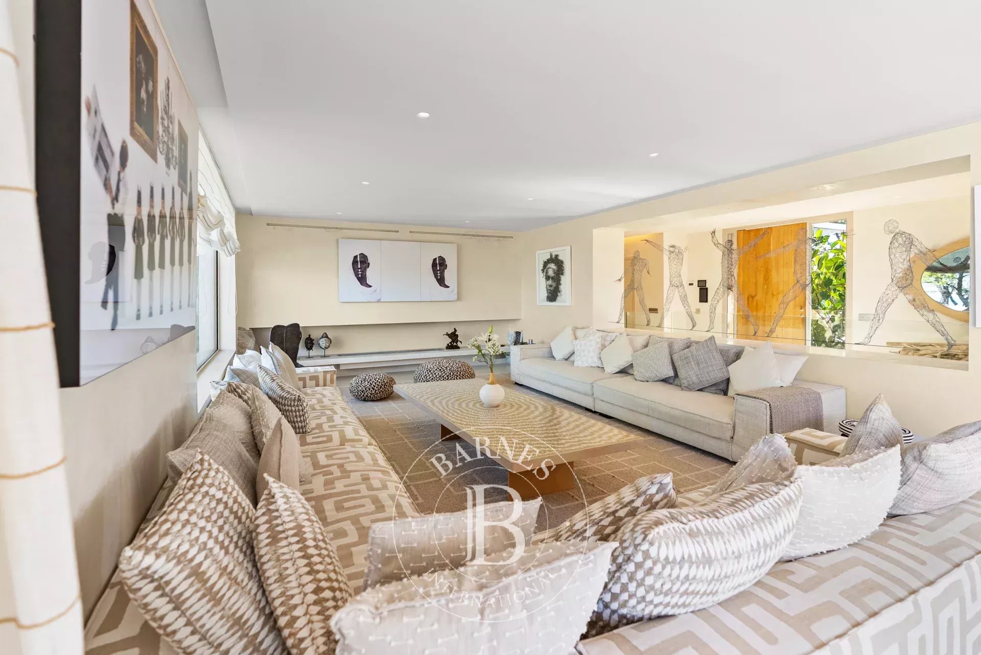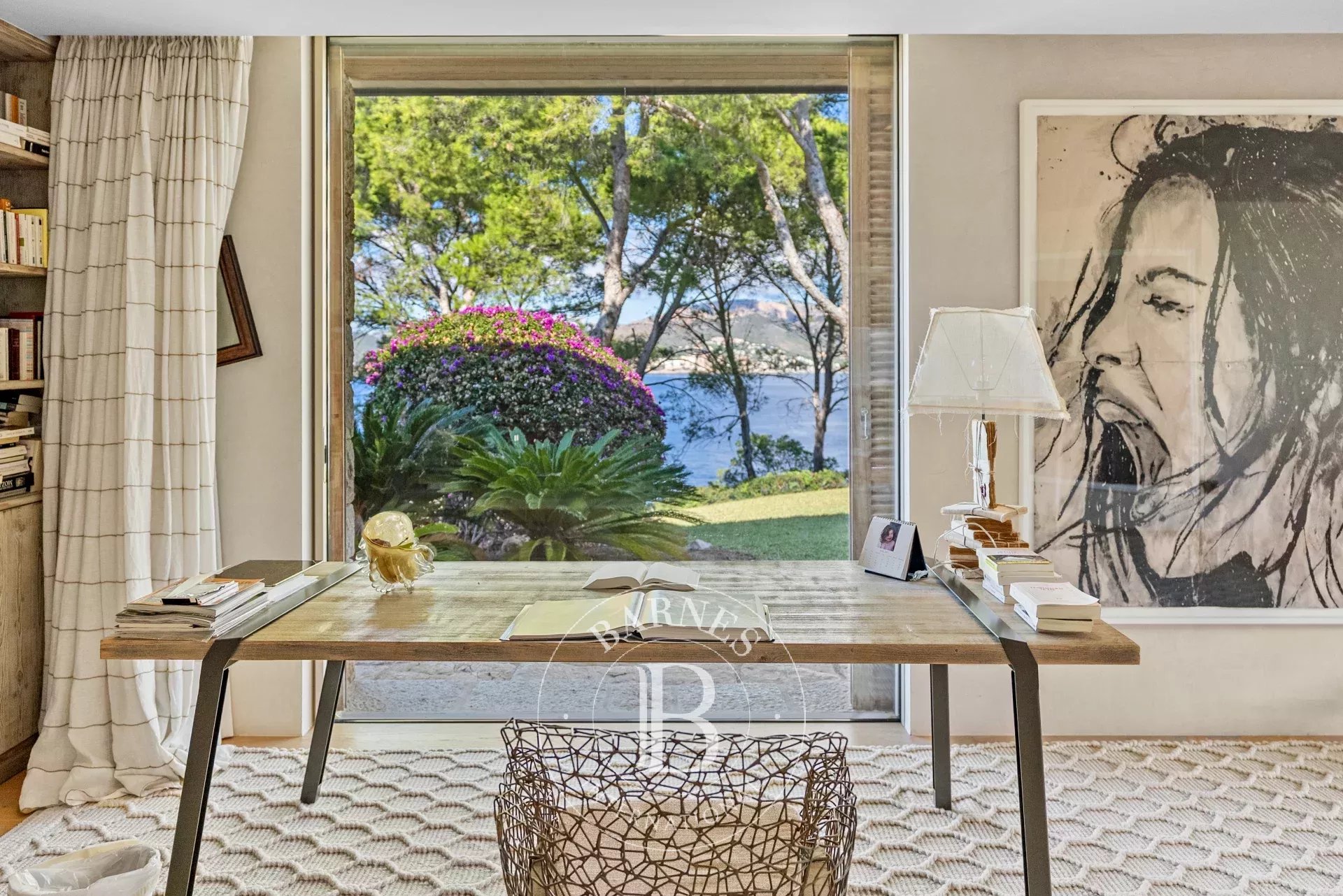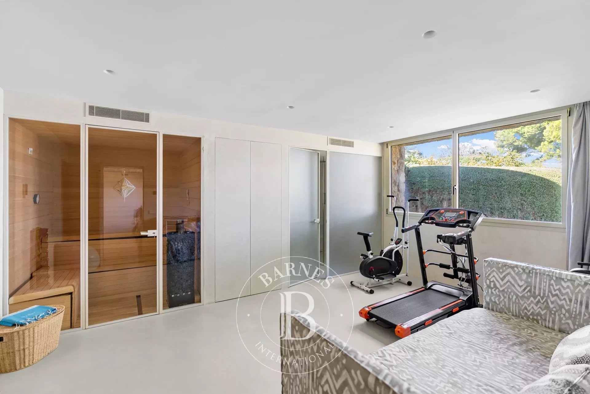 A l'interieur, les espaces de vie de la villa sont lumineux et accueillants, avec de grandes fenetres qui encadrent l'horizon mediterraneen. Le chauffage au sol avec pompe a chaleur, une cuisine totalement equipee avec menuiserie sur mesure et un ascenseur Elevaric offrent un confort moderne sans compromettre l'integrite estetique de la propriete. Le design allie elegance d'inspiration boheme et finitions de haute qualite, creant un environnement harmonieux pour la detente et le divertissement.
