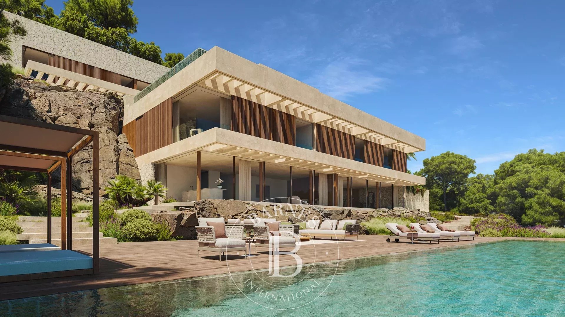 A private path leads from the lower pool to a marina, where a tender can transport residents to a yacht anchored just offshore, an exceptional feature that elevates the property's appeal for boating enthusiasts. The foundation and excavation works are scheduled to commence in 2025, offering the prospective buyer the unique advantage of personalizing the final touches of the project while bypassing the often lengthy and complex planning and approval processes. This purchase includes both the plot and the fully approved project, setting the stage for a swift transition from acquisition to construction.