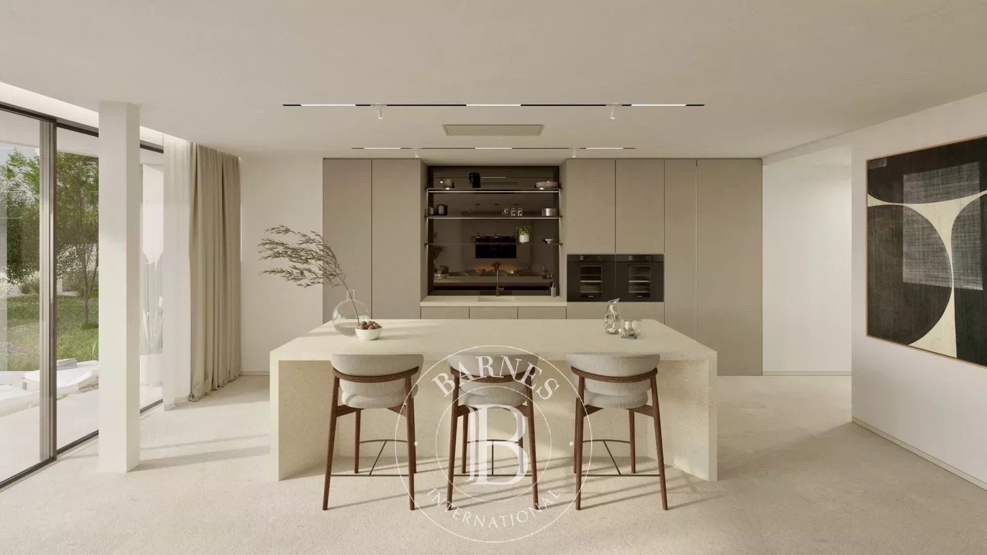 Outdoors, the 26 square meter infinity pool integrates naturally into the landscape, offering a serene retreat just steps from the fine sandy beach of Camp de Mar. Golf enthusiasts will appreciate immediate access to the nearby renowned golf course. The villa includes three parking spaces with a stylish pergola, and construction adheres to German quality standards with energy-efficient technology throughout.