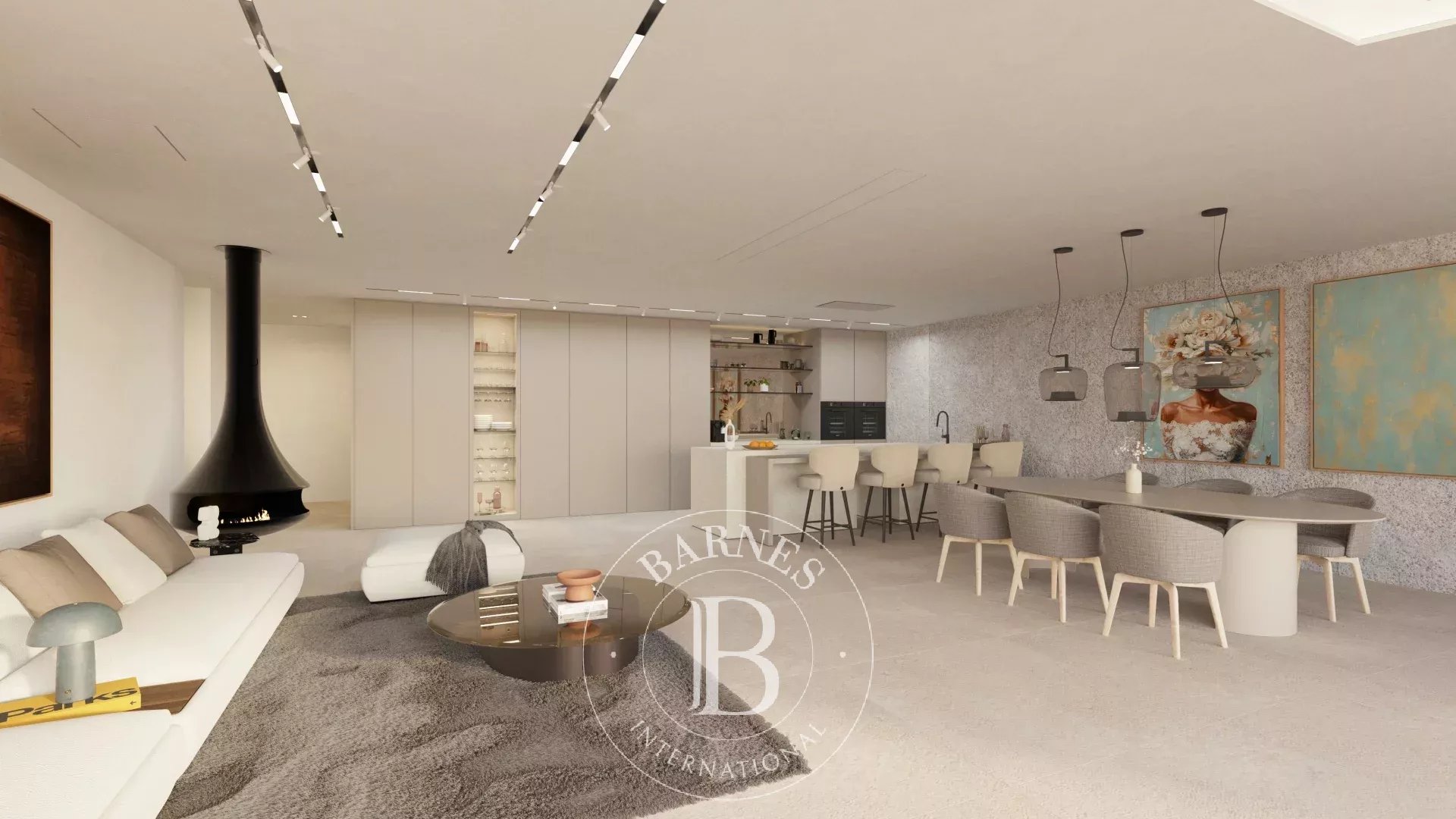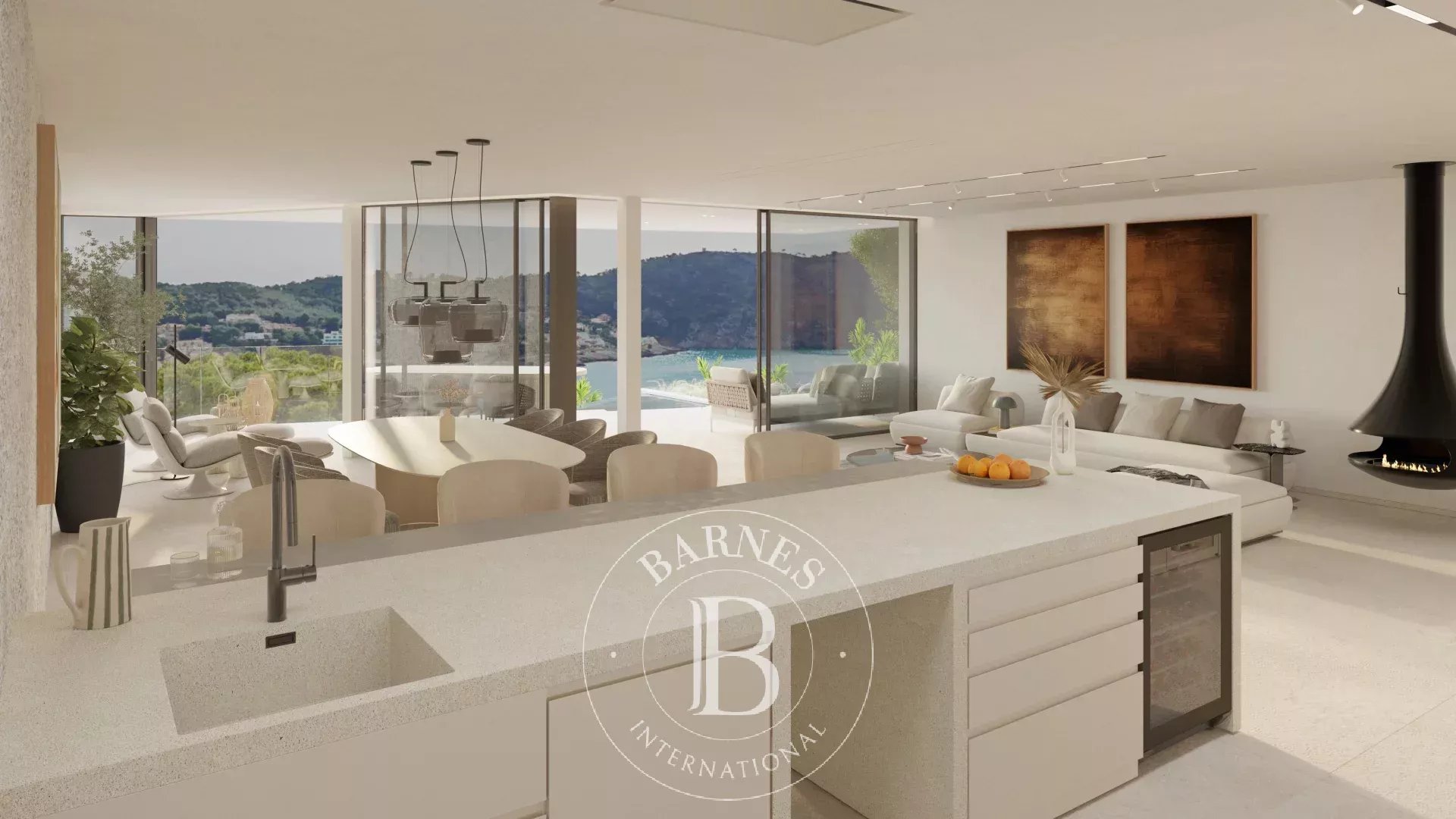 The open-plan living and dining area features a contemporary fireplace and expansive floor-to-ceiling sliding doors, seamlessly connecting the interior with the sun-soaked pool terrace. The infinity pool and spacious sun terrace form the centerpiece of a Mediterranean-style garden designed for both relaxation and entertaining. The designer kitchen combines a central cooking island with a built-in wine cabinet and premium appliances, reflecting a refined sense of style and practicality.
