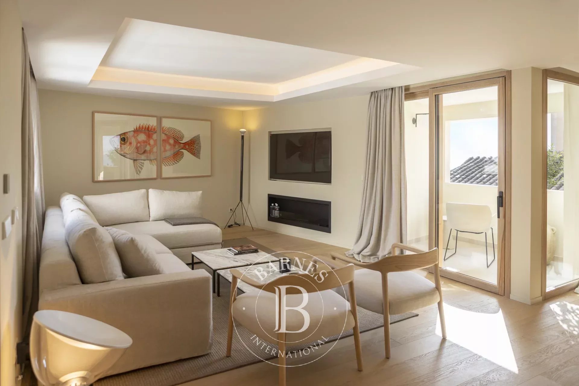 This recently renovated apartment, completed in 2026, offers 126 square meters of sophisticated living space on the sixth floor of a well-maintained building with elevator access. Designed with high-quality materials and neutral tones, the residence balances elegance and practicality while emphasizing comfort. The open-plan living, dining, and kitchen area is bright and inviting, featuring a fireplace, Miele-equipped kitchen, and oak parquet floors alongside durable tiled surfaces.