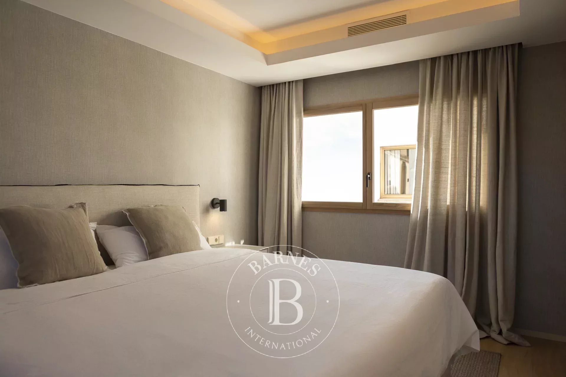 Two spacious bedrooms and two fully appointed bathrooms provide ample privacy, complemented by a guest toilet and a utility area. The 17-square-meter covered terrace offers panoramic views of the sea and the Church of Santa Eulalia, creating a serene backdrop for everyday living. Large double-glazed windows ensure natural light throughout, while central air-conditioning keeps the apartment comfortable year-round.