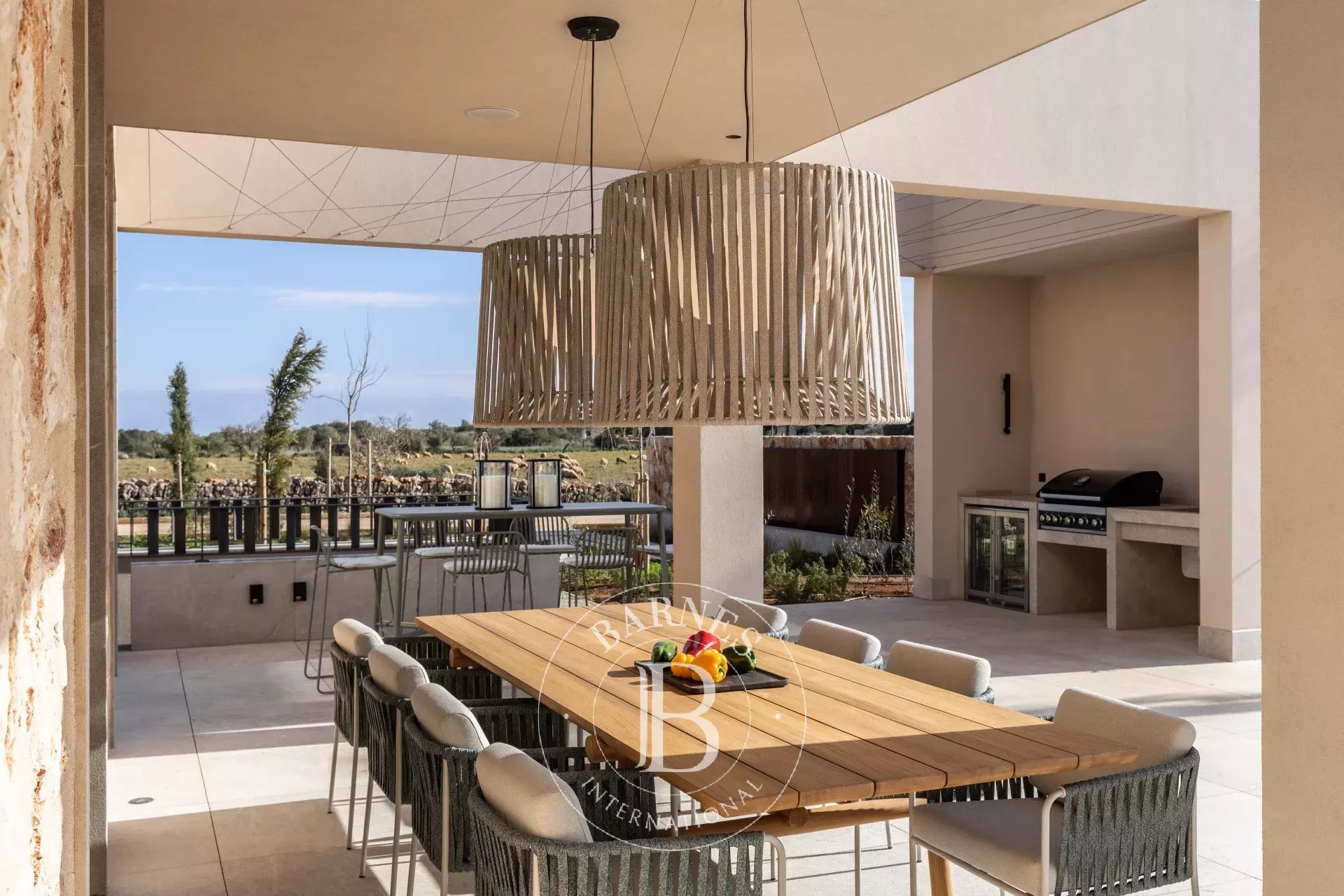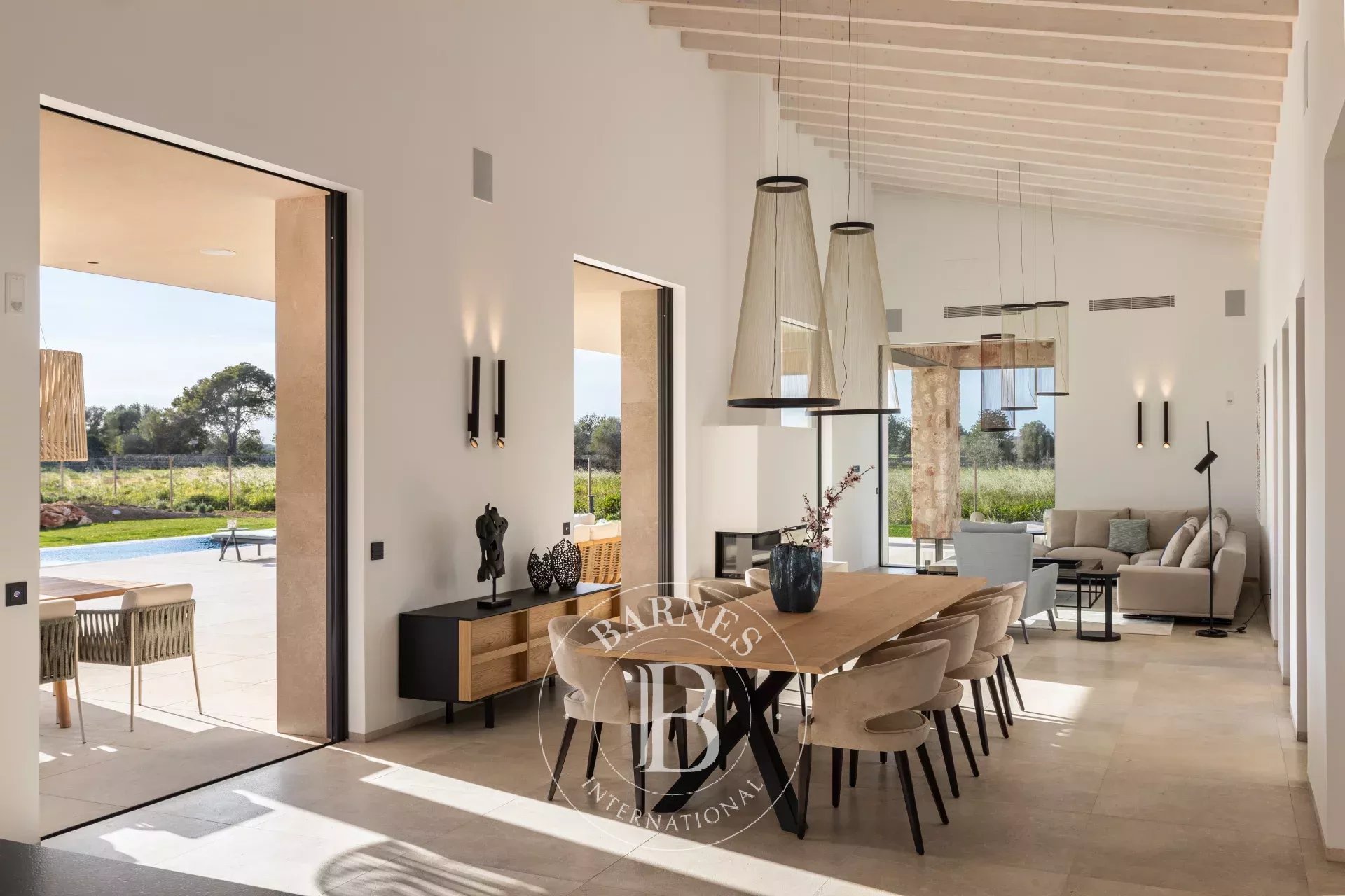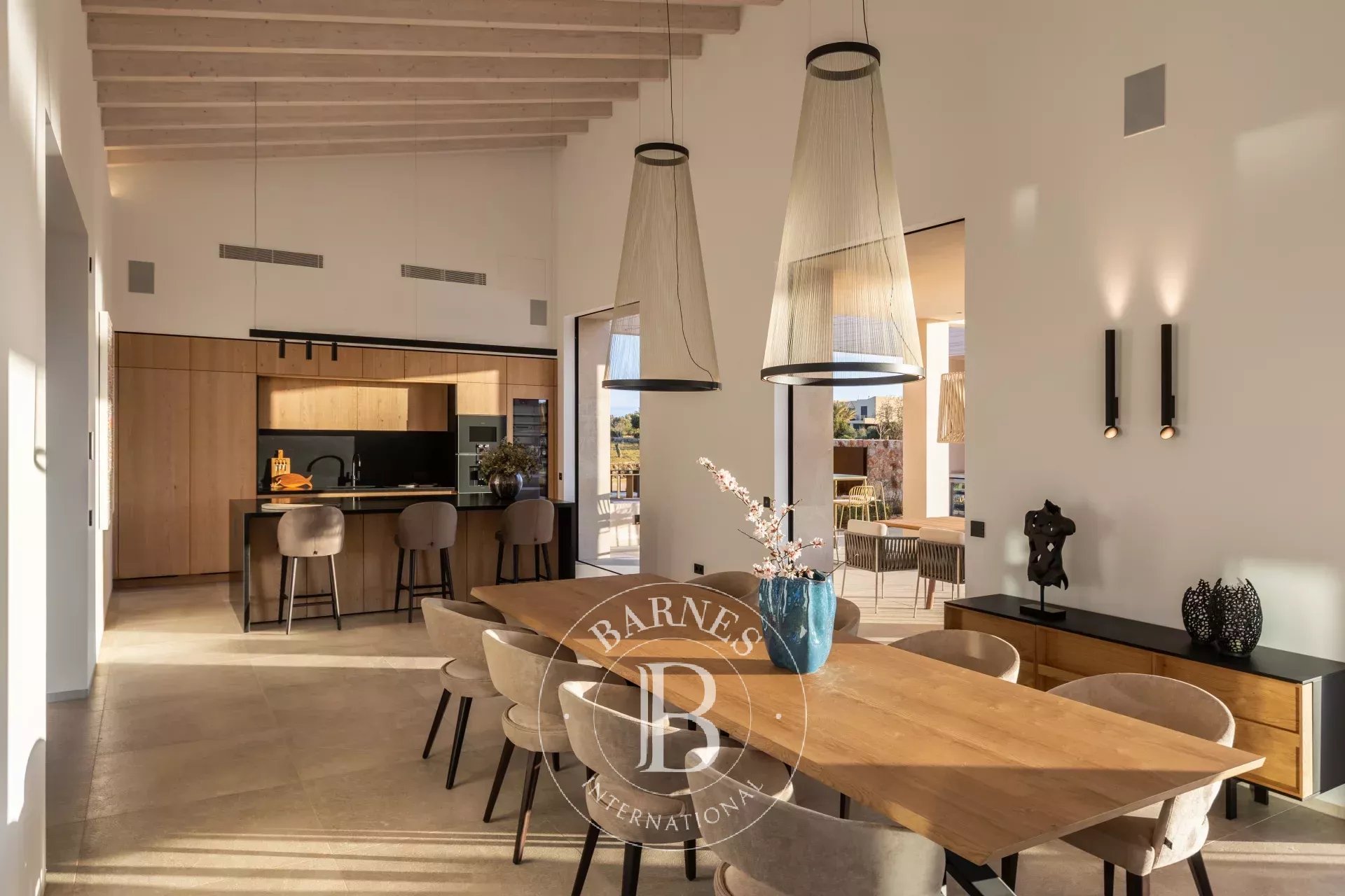 Outdoor living is a defining feature, with 170 square metres of terraces, covered porches and landscaped gardens surrounding a 44 square metre swimming pool. An outdoor kitchen and barbecue area extend the living spaces seamlessly into the garden, ideal for long evenings outdoors. A 49 square metre garage and storage complete the property.