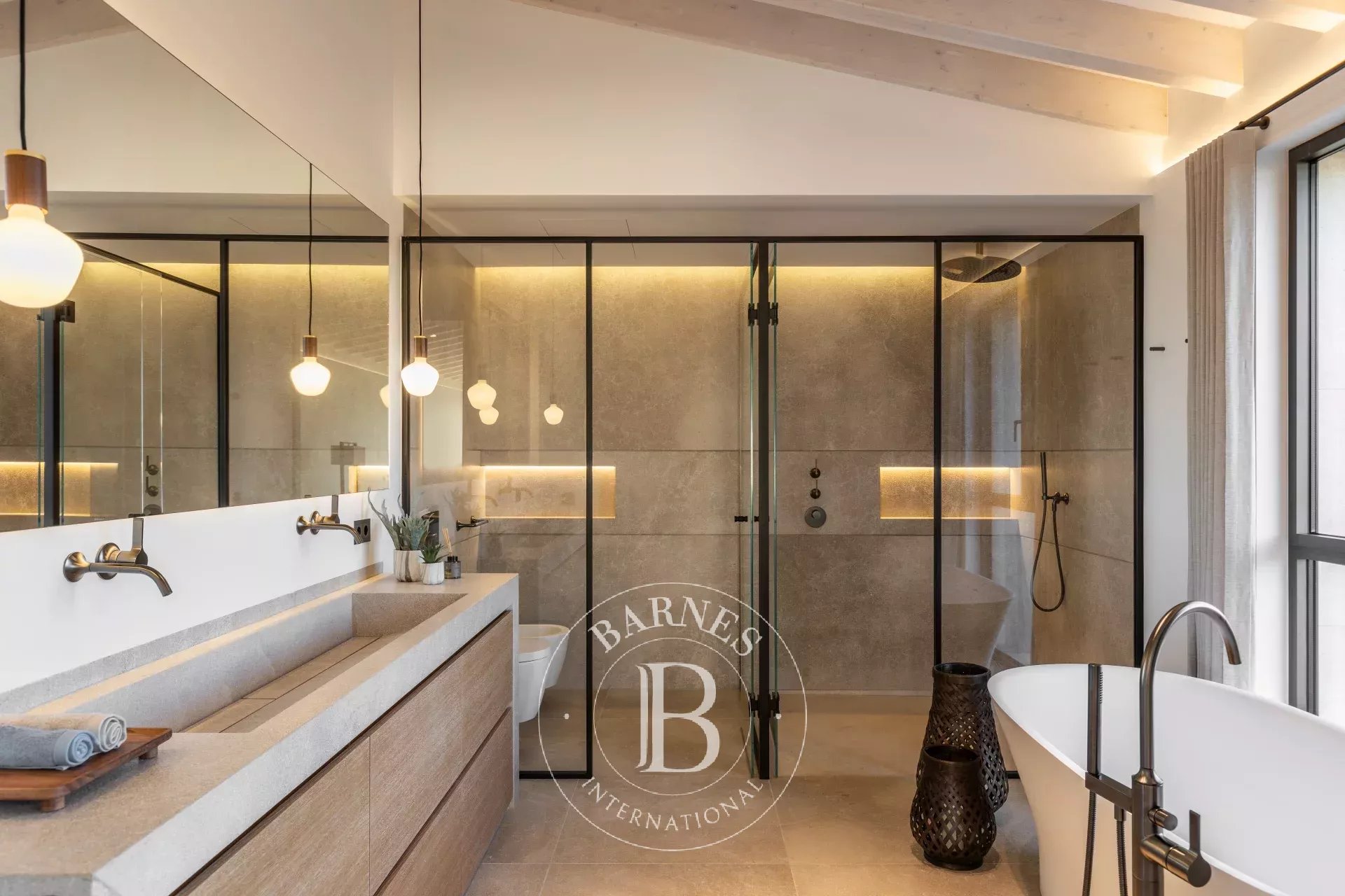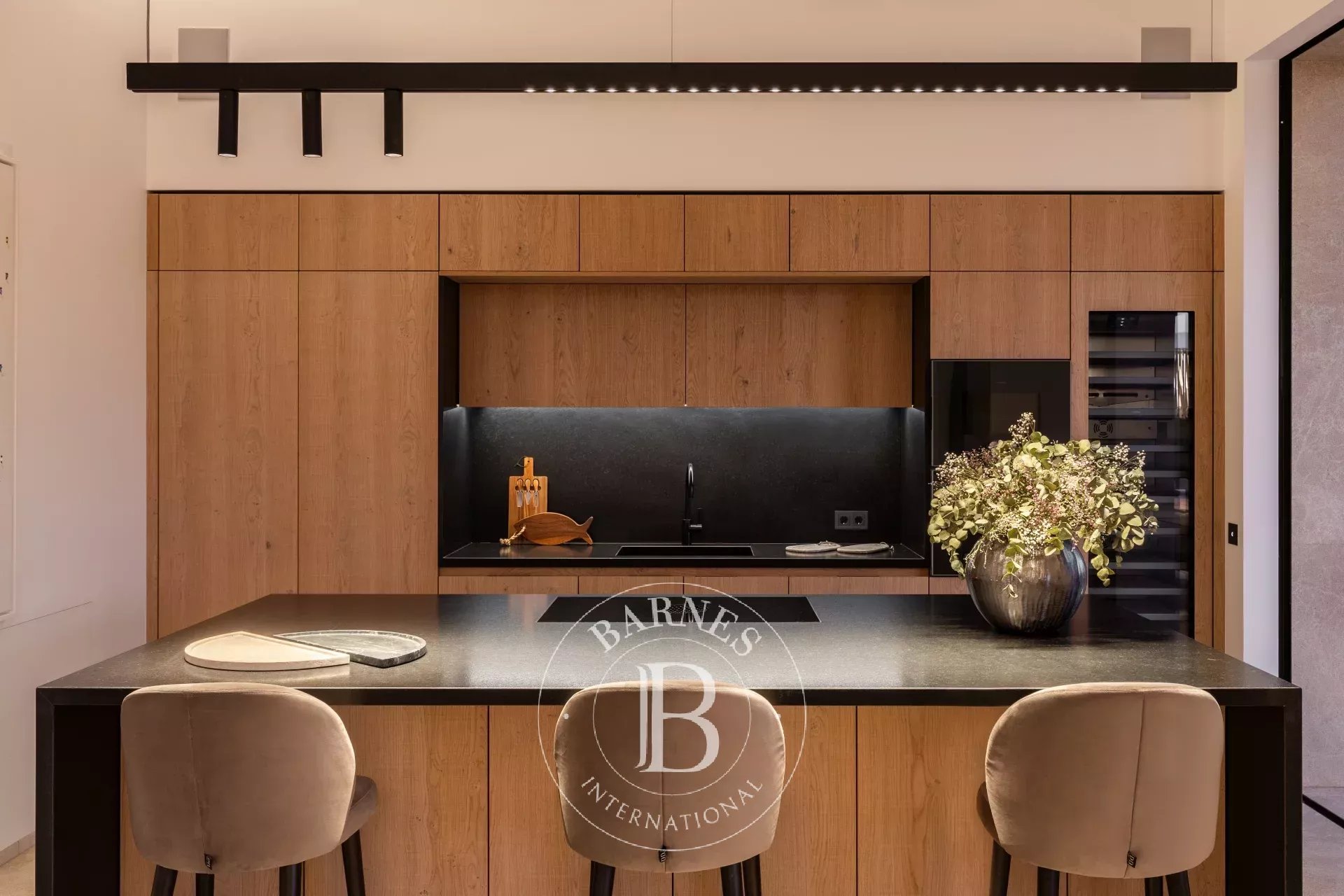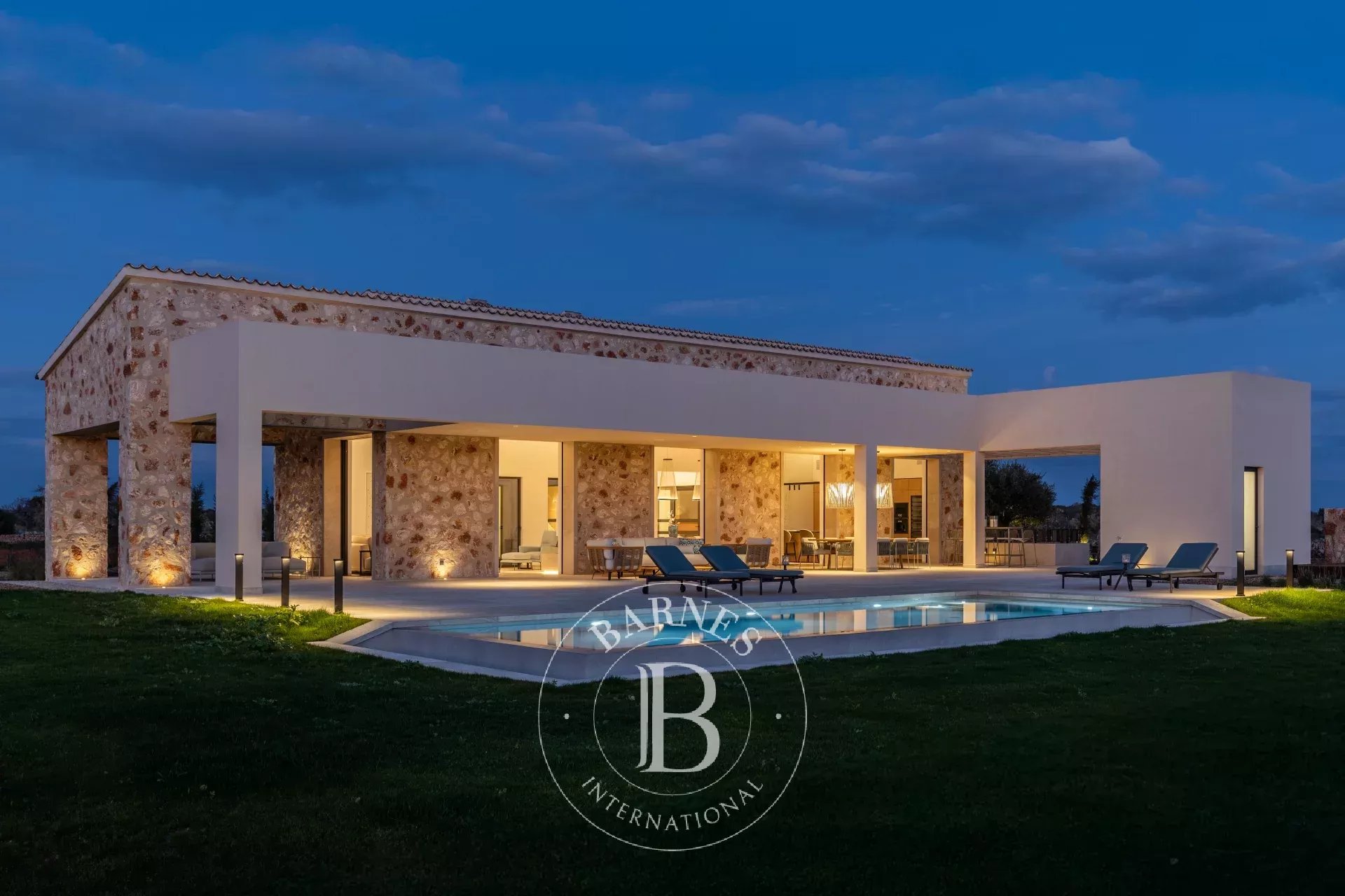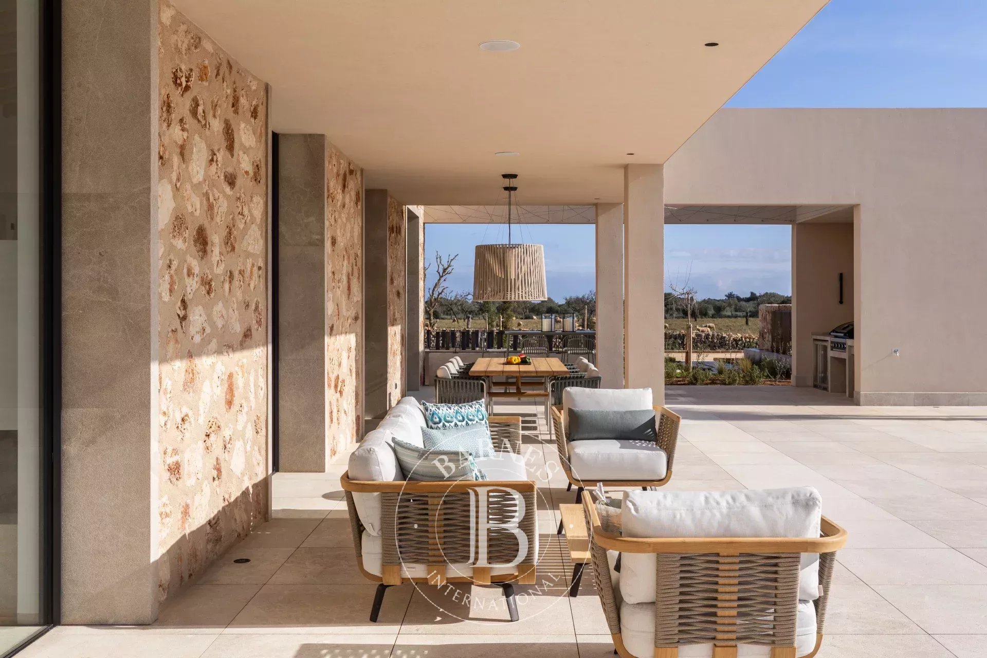 Outdoor living is a defining feature, with 170 square metres of terraces, covered porches and landscaped gardens surrounding a 44 square metre swimming pool. An outdoor kitchen and barbecue area extend the living spaces seamlessly into the garden, ideal for long evenings outdoors. A 49 square metre garage and storage complete the property.