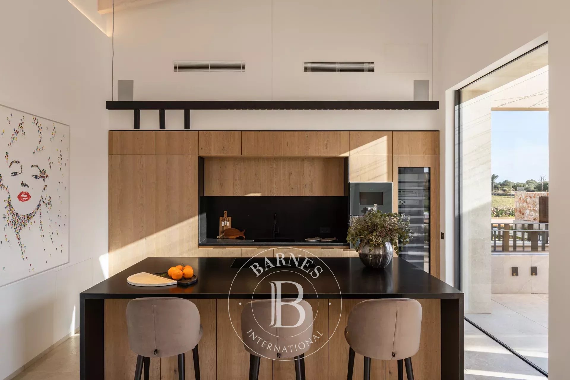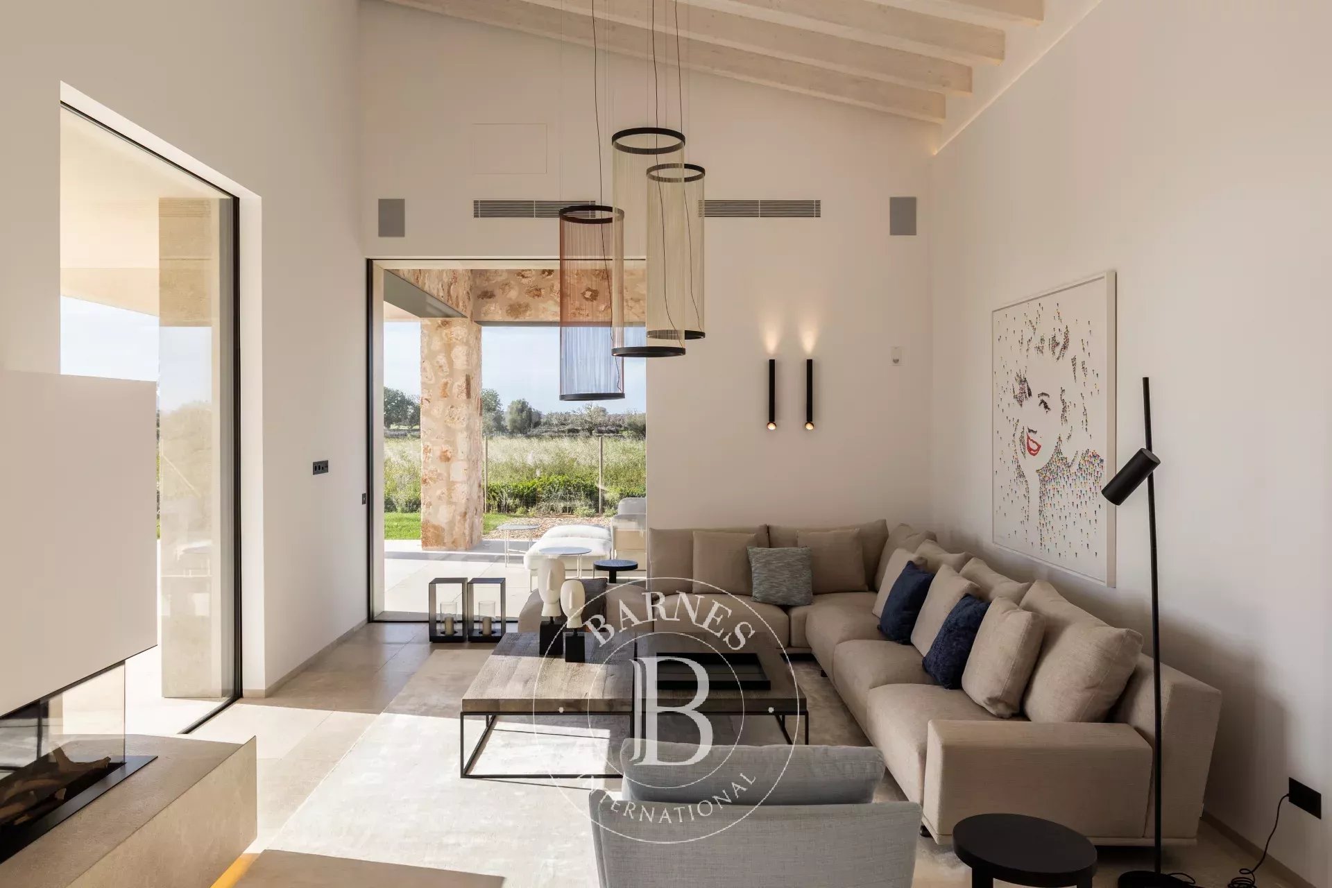 The heart of the home unfolds through a bright living, dining and kitchen space where contemporary design meets authentic Mallorcan architecture. Natural stone façades, oak wood floors and high attic ceilings create a calm and elegant atmosphere, while large glazed openings and an interior gallery draw daylight deep into the home. A fireplace anchors the living room, and the modern kitchen with a central island is designed for both daily living and entertaining.