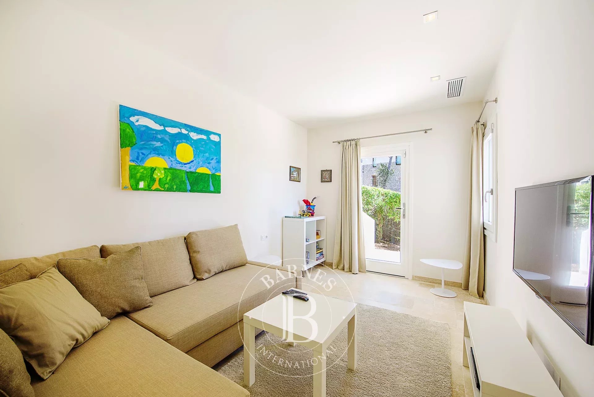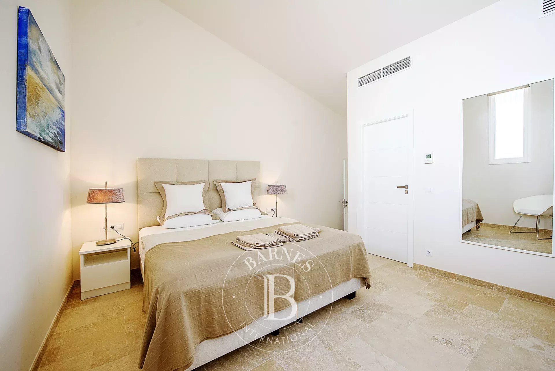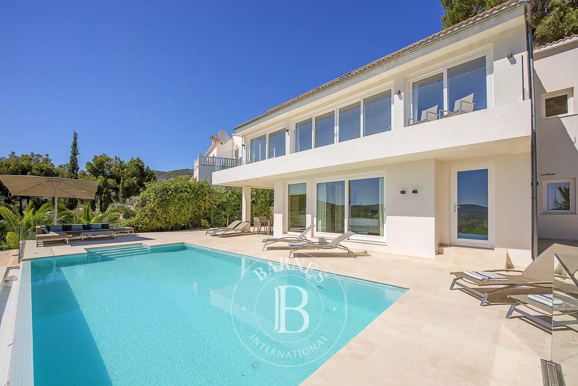 The villa’s design maximizes natural light and scenic vistas, while underfloor heating, air conditioning, and WLAN ensure year-round comfort. The garden spans 300 m² and surrounds a luminous pool deck with sun and shaded areas, providing an inviting space for relaxation. Parking is included on the property for convenience.