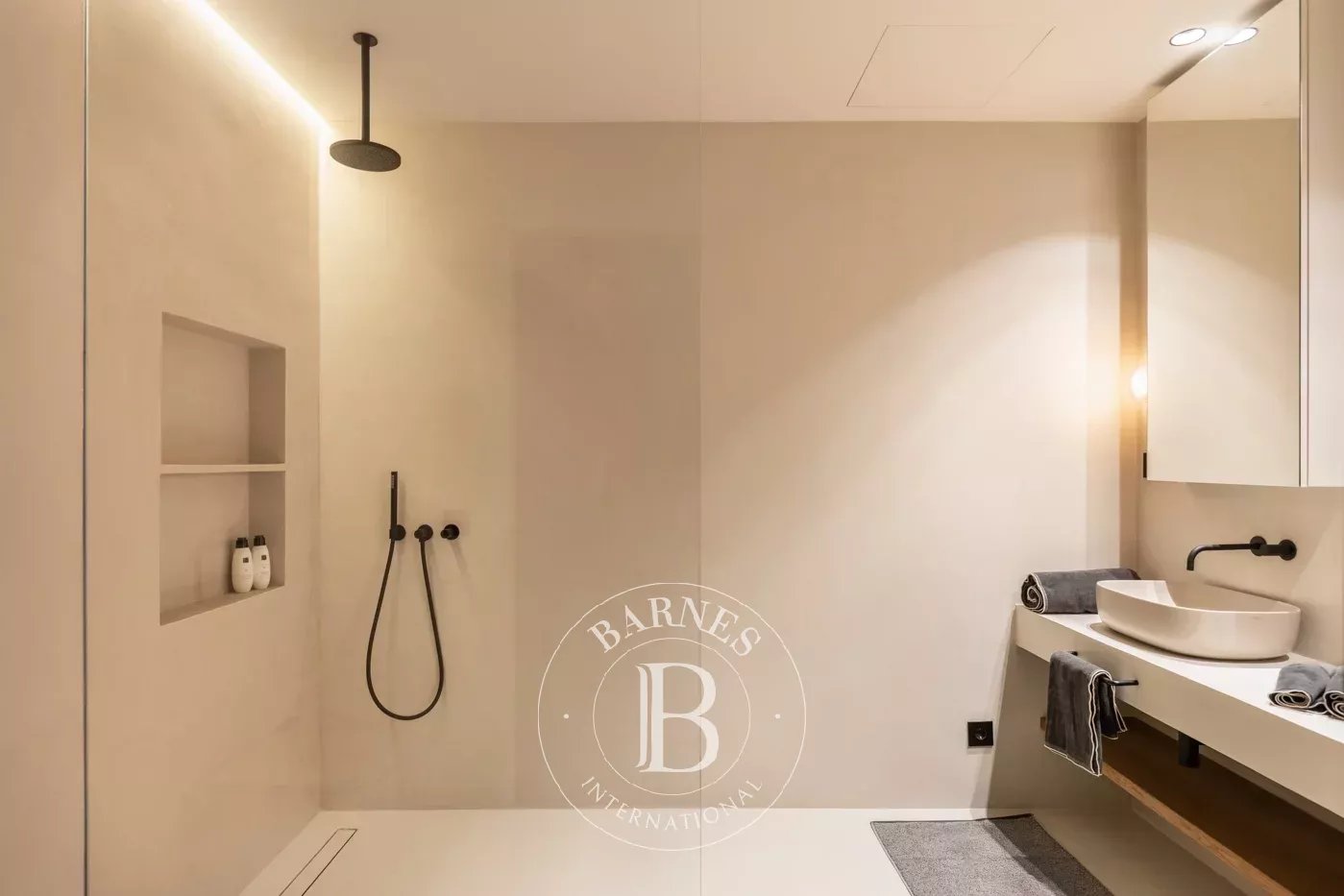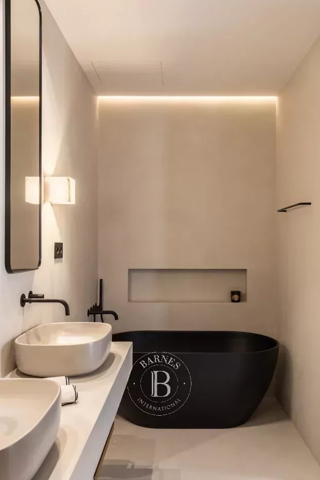 The exterior areas have been carefully planned for both relaxation and entertaining. A private patio provides an intimate setting for outdoor dining, while the lower terrace features a swimming pool, a tranquil lounge area, and lush Mediterranean planting, forming a secluded and peaceful retreat.