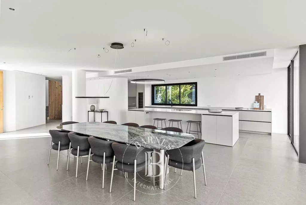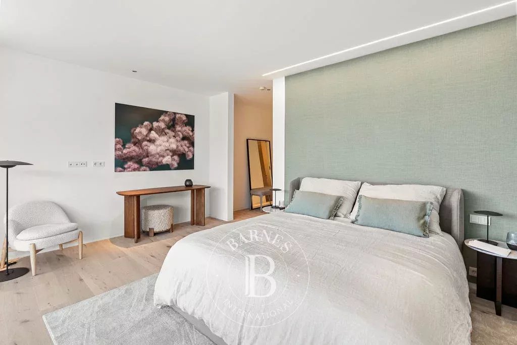 The heart of the home features a bright living and dining area adjoining a modern, open-plan kitchen and an elegant fireplace, ideal for both entertaining and daily life. Expansive terraces overlook a 55 square meter swimming pool, complemented by a meticulously landscaped garden and a quiet patio, offering outdoor spaces designed for relaxation.