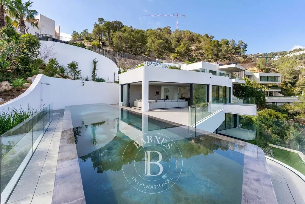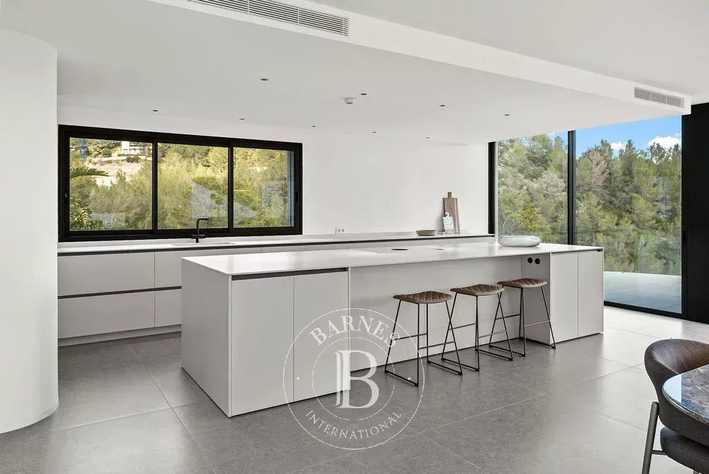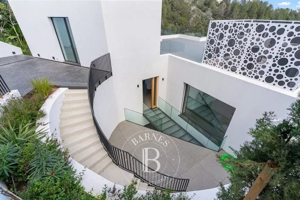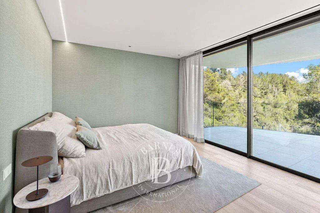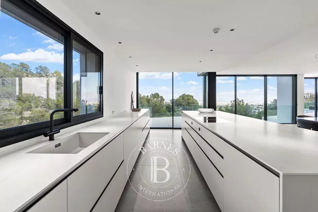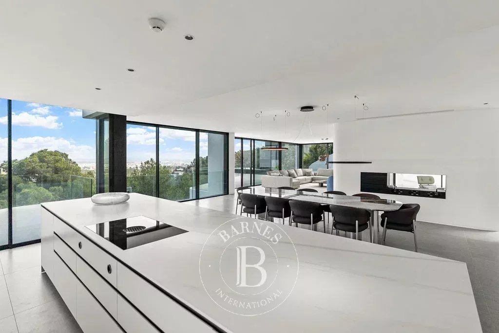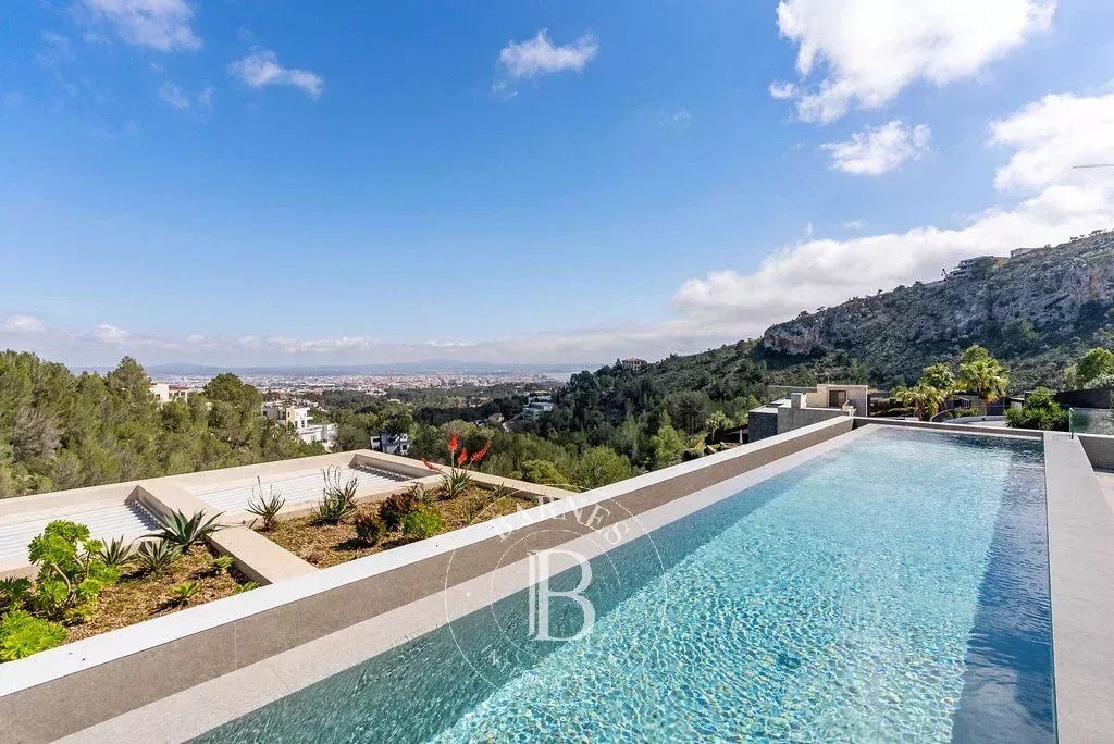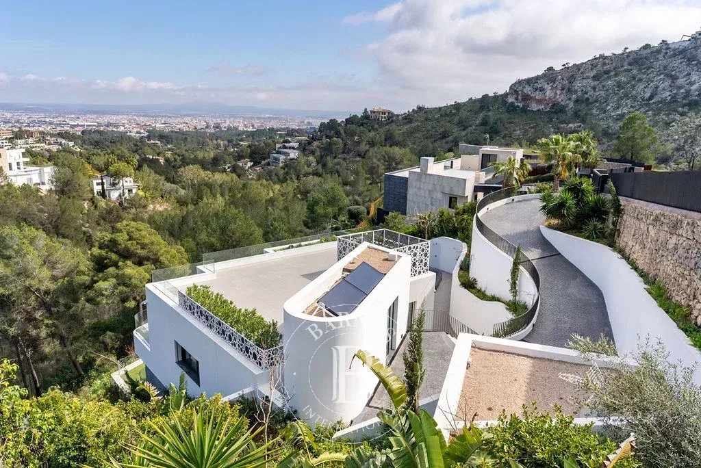 Completed in 2025, this contemporary villa in Son Vida offers approximately 825 square meters of refined living space on a generous 2,230 square meter plot. The property presents unobstructed views of lush greenery and the cityscape of Palma, providing a serene yet connected environment. A private driveway leads to a four-car garage, while an elevator and staircase provide seamless access to the main floor.