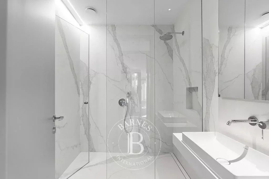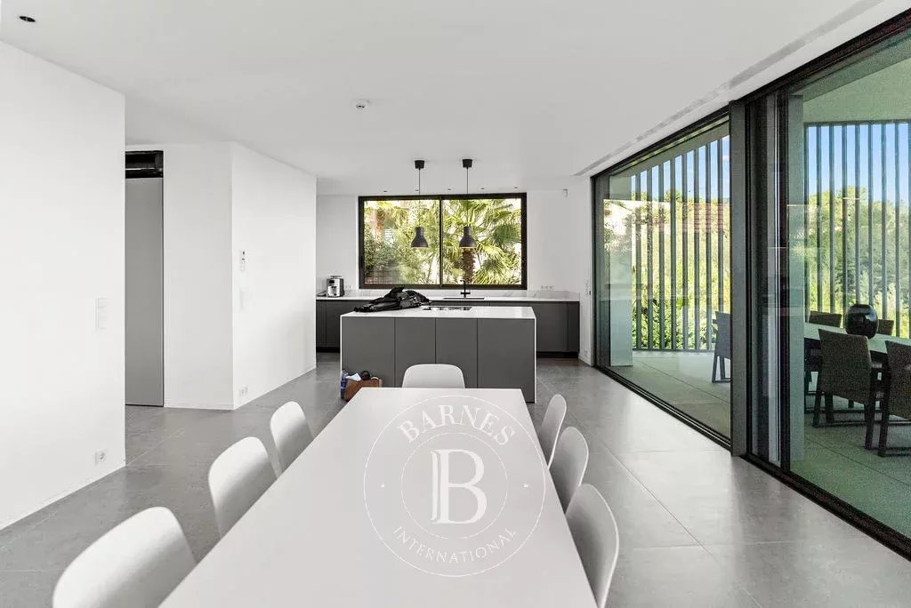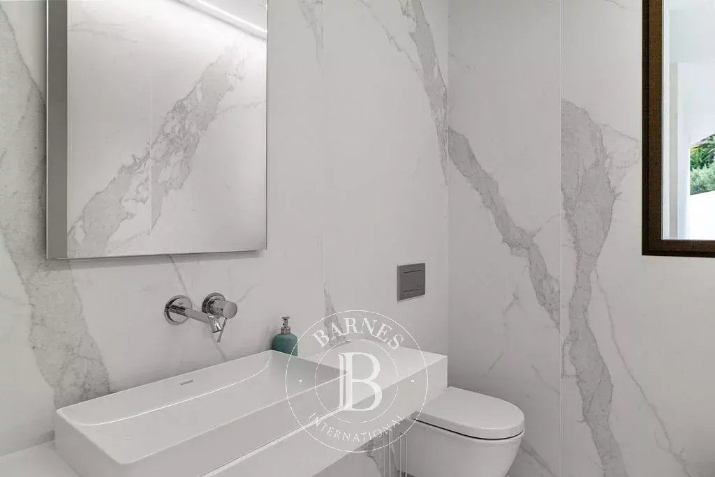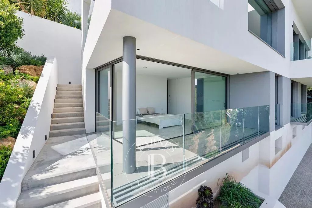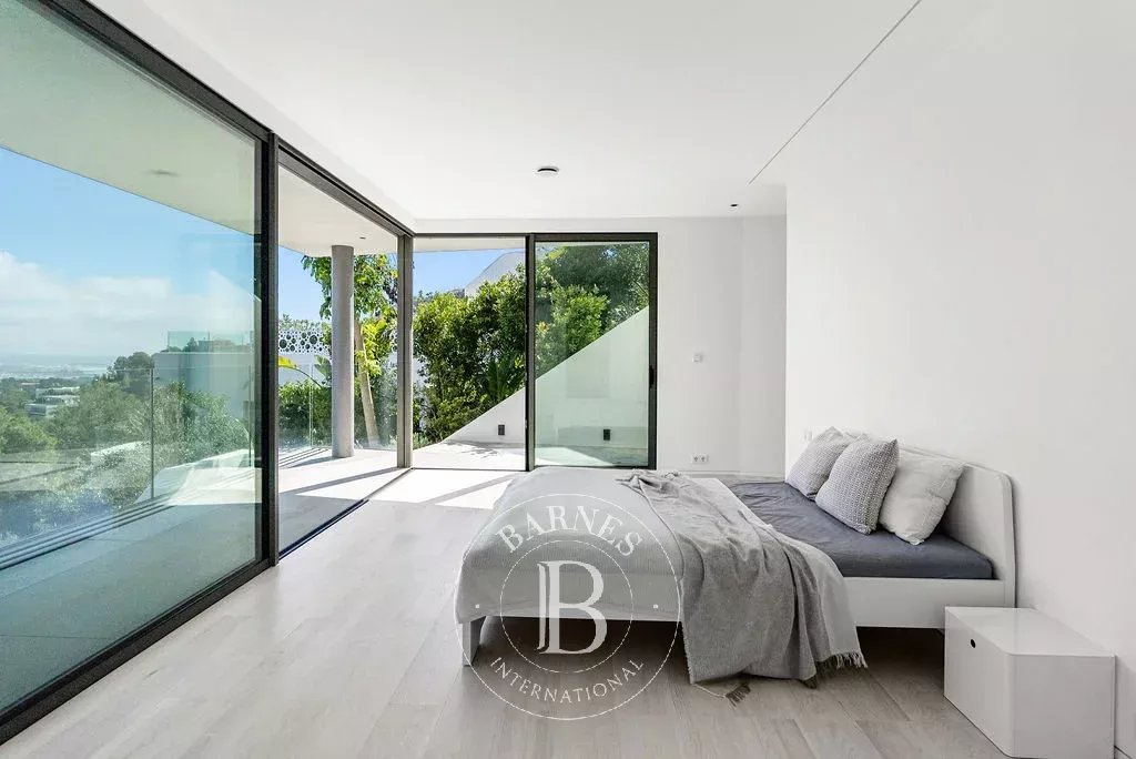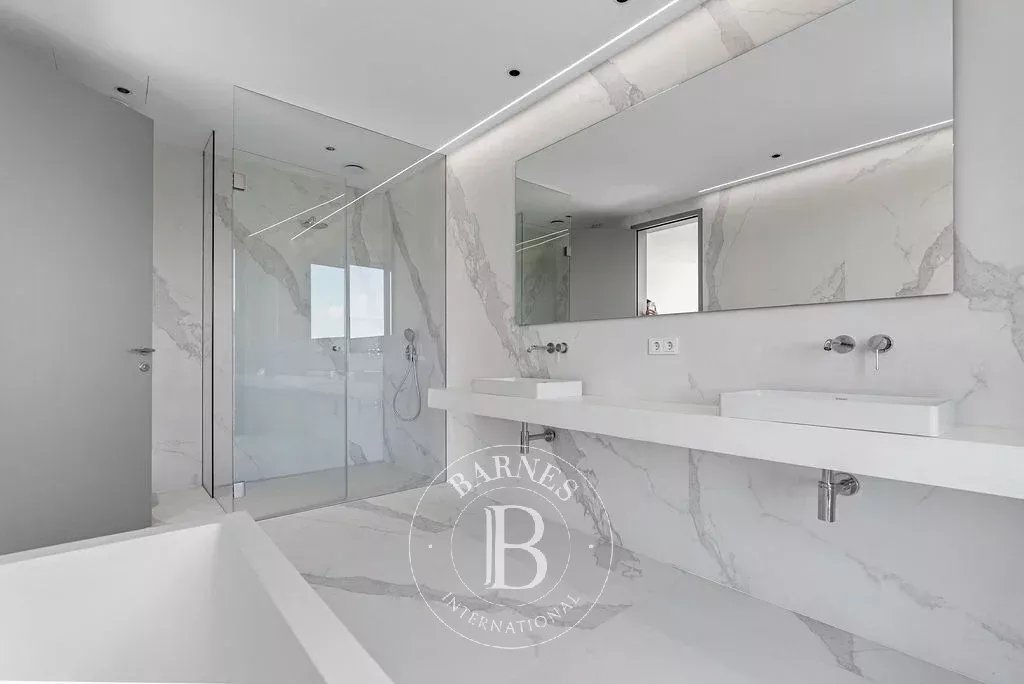 The upper floor hosts a 65 m² swimming pool accompanied by a large sun terrace, creating an ideal setting for relaxation and entertaining. The bedroom level includes a master suite and four additional bedrooms, each with a private bathroom, ensuring comfort and privacy for family and guests.