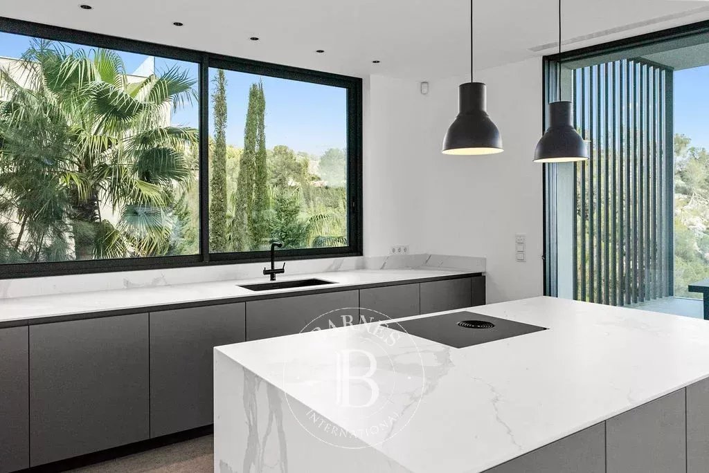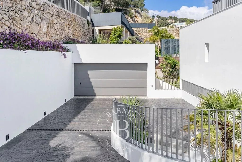 Completed in 2024, this modern villa in Son Vida offers 768 m² of refined living space on a 2,231 m² plot. Designed across multiple levels, the home blends comfort and functionality with striking views of Palma and the Mediterranean. A private driveway leads to a four-car garage, welcoming residents into a spacious entrance hall. The ground floor features an open-plan kitchen flowing into a bright dining area and a generous living room, all connecting to a covered terrace that frames the city and sea. A guest toilet and a lift serving every level add convenience and accessibility.