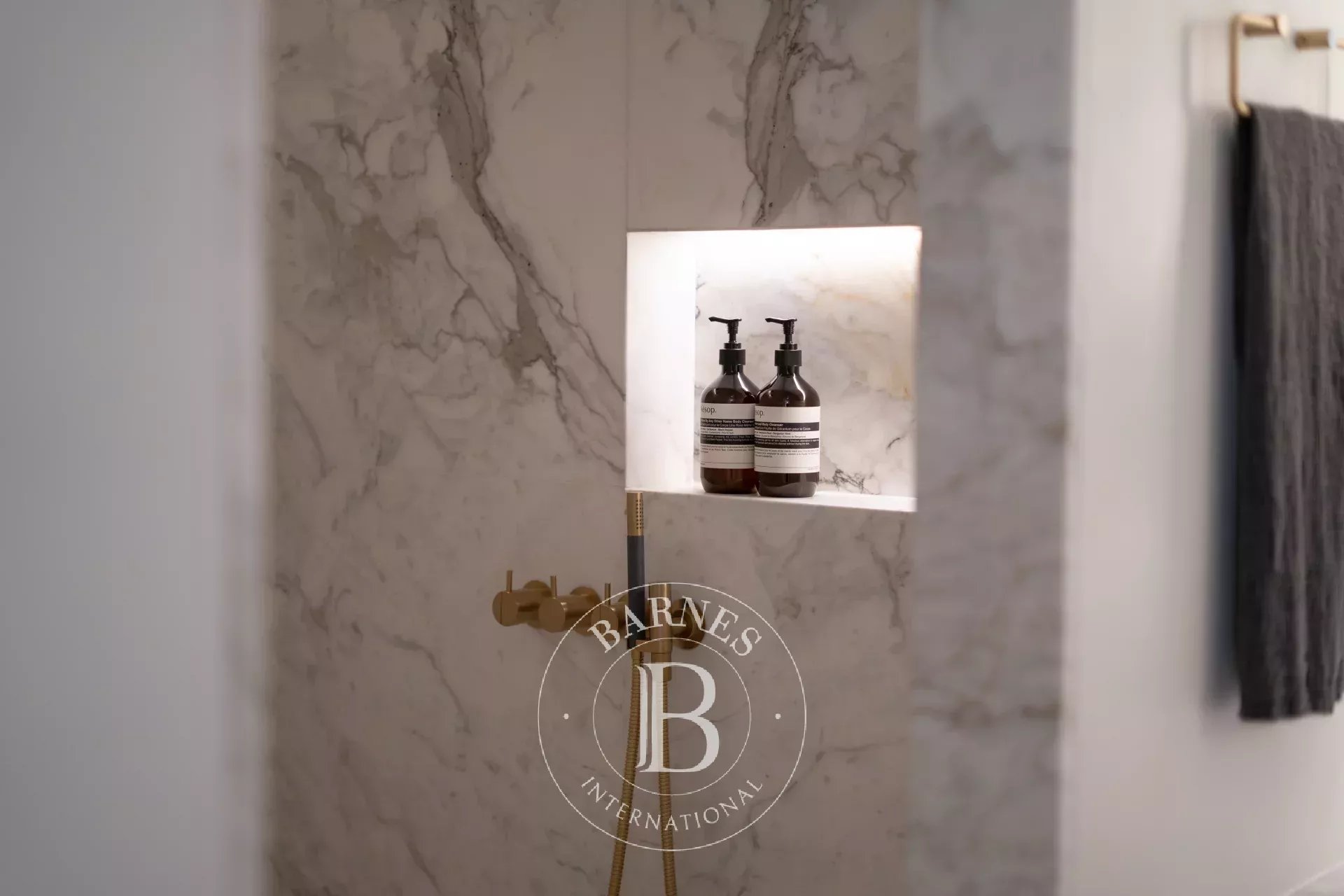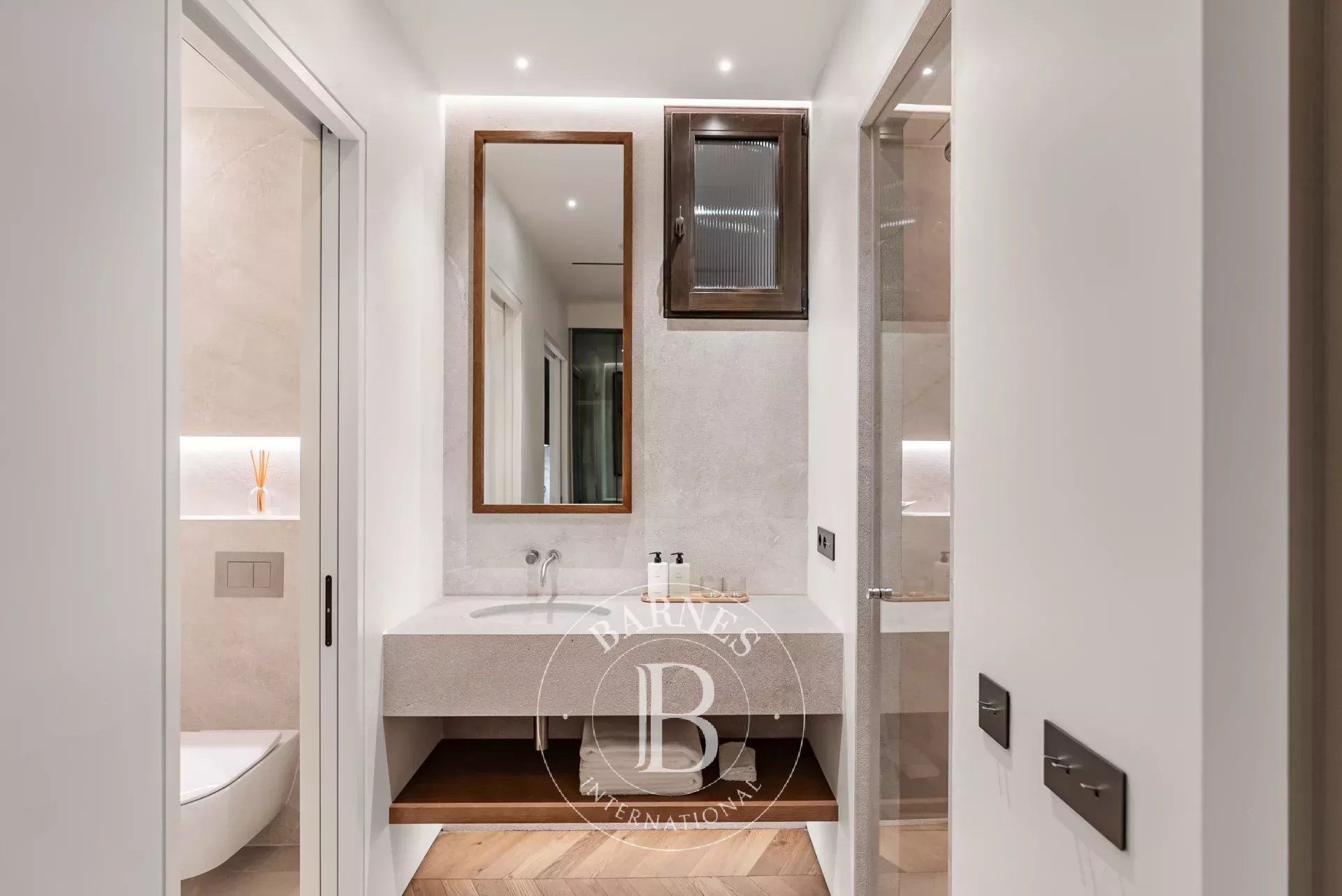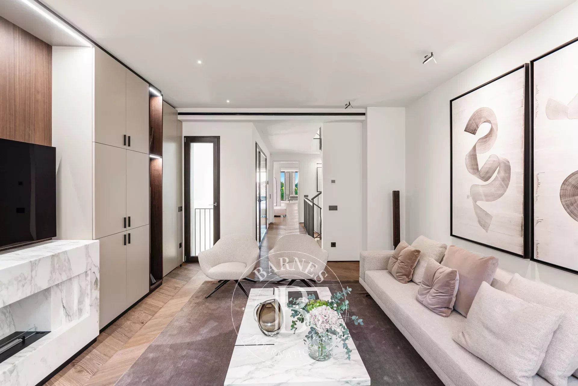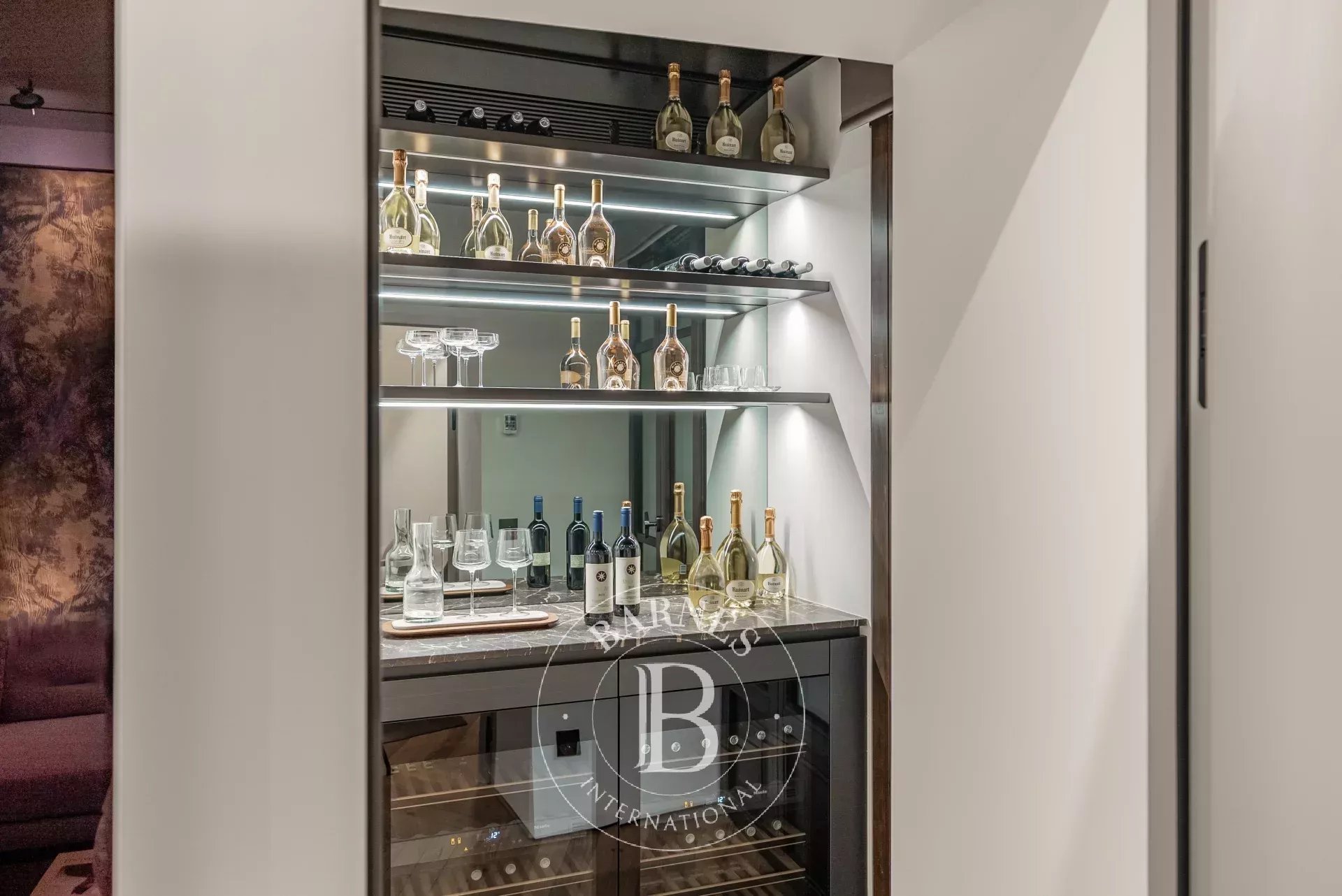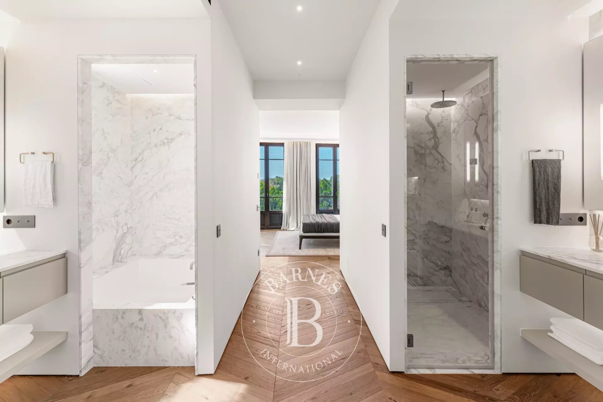 The main living areas are bright and spacious, with large windows and balconies bringing in plenty of natural light. The property includes two generous living rooms, elegant dining areas, and three fully equipped kitchens with modern appliances and custom-made cabinetry. Additional features include a private cinema room, a library, and a temperature-controlled wine cellar. There is also a wellness area with a gym and sauna, as well as underfloor heating and air conditioning throughout.
