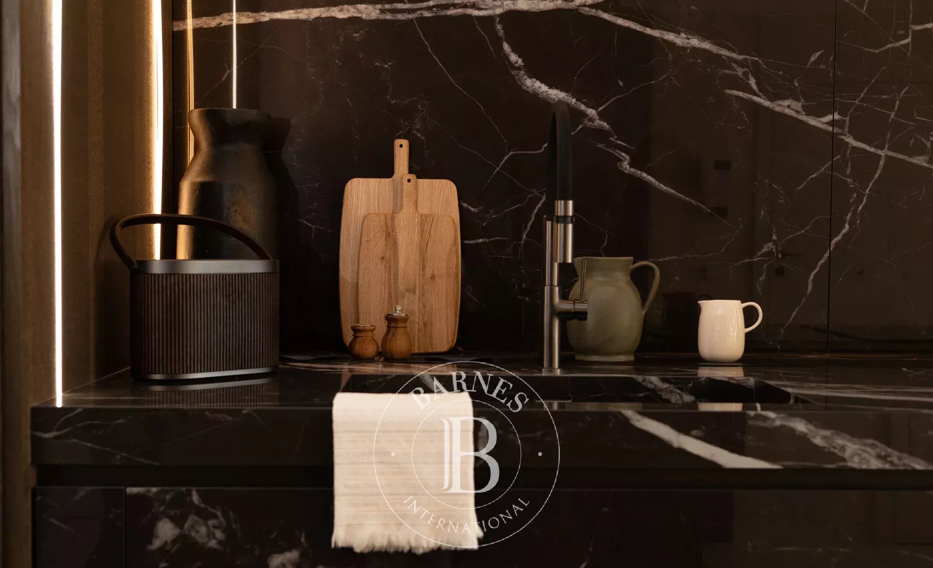 The kitchen is custom built and fitted with high quality appliances, including AEG, and integrates effortlessly into the living area. Microcement flooring runs throughout the apartment, complemented by bespoke elements such as custom wardrobes, made to measure curtains and integrated storage.