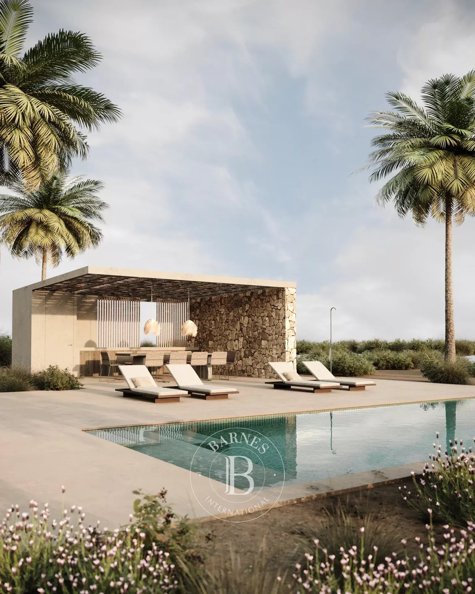 Outdoor living has been designed as an extension of the house itself, with landscaped gardens, Mediterranean planting and a full irrigation system ensuring easy maintenance year-round. A swimming pool and sun terraces create open and private outdoor areas, while the integration of a solar panel field adds an energy-efficient dimension to the property.